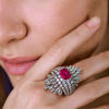 Кольцо выполненное из белого золота 750 пробы с 174 природными бриллиантами классической формы огранки общей массой 3,50 ct. и 1 синтетическим рубином массой 3,50 ct. Цвет - Red . Размер кольца - 18,75 (58). Вес - 20,46 гр. В комплекте экспертное заключение Геммологического центра МГУ. Размер кольца можем изменить по Вашему желанию.