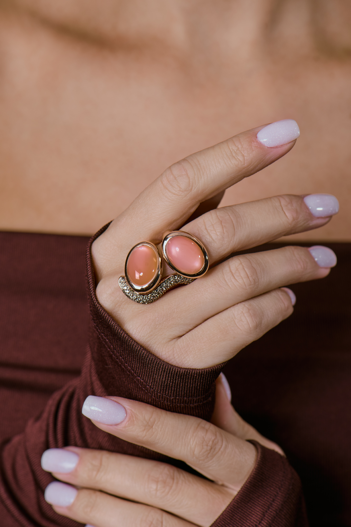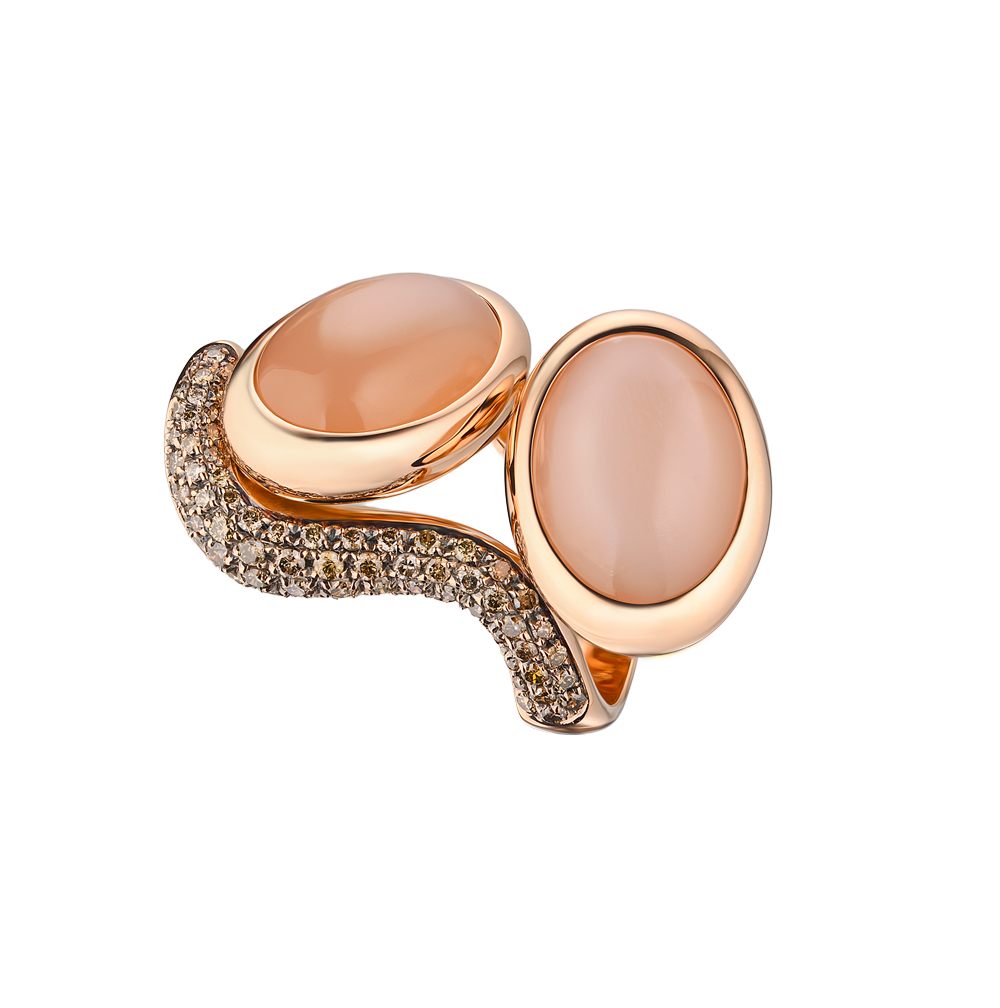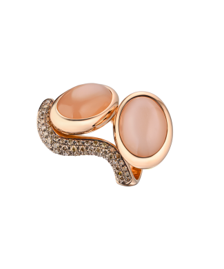 Кольцо выполненное из розового золота 750 пробы с 2 лунными камнями формы огранки кабошон и 68 коньячных бриллиантов классической формы огранки общей массой 0,80 ct. Диаметр кольца 35 х 25 мм. Размер - 17,5 (55). Вес - 25,09 гр.