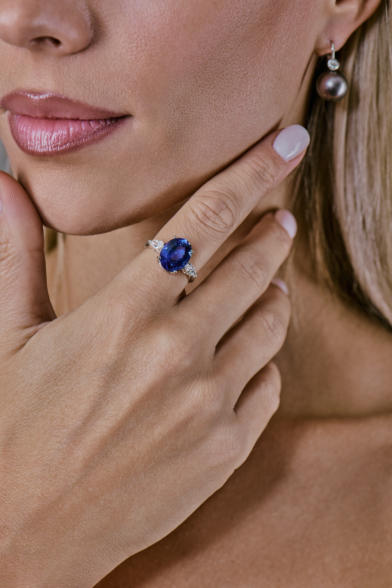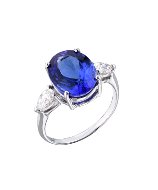 Кольцо, выполненное из белого золота 750 пробы с природным танзанитом общей массой 5,20 ct., и 2 бриллиантами формы огранки "Груша" общей массой 0,53 ct. Танзанит формы огранки "Овал клиньевая" цвет - Глубокий фиолетово-синий (Deep Violetish Blue). Чистота - VS. Размер кольца - 18,0 (57). Вес - 4,18 гр. В комплекте прилагается экспертное заключение Геммологического центра МГУ. Размер кольца можно изменить по Вашему желанию абсолютно бесплатно.