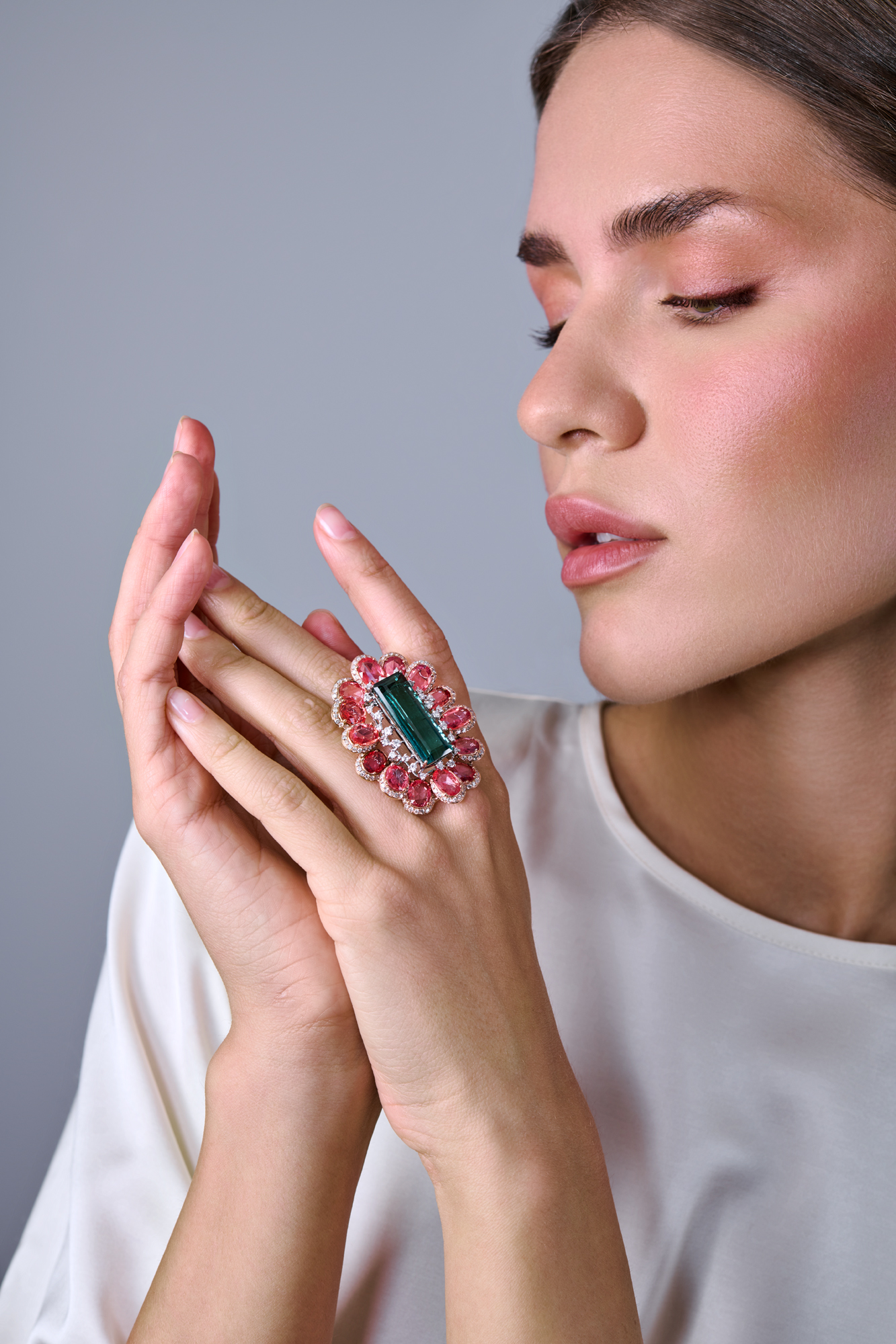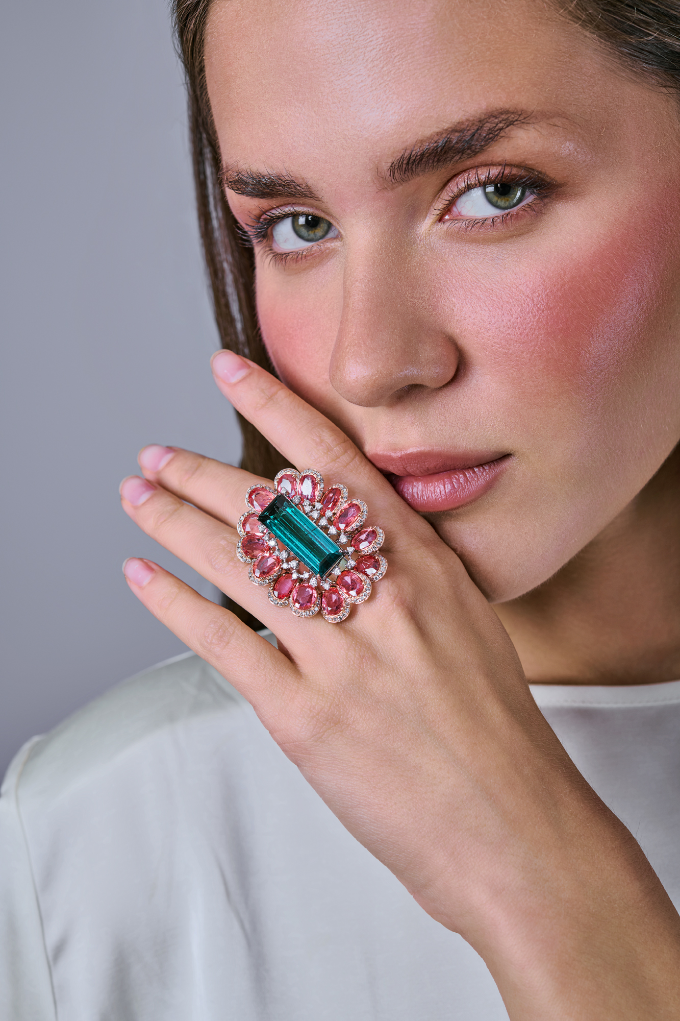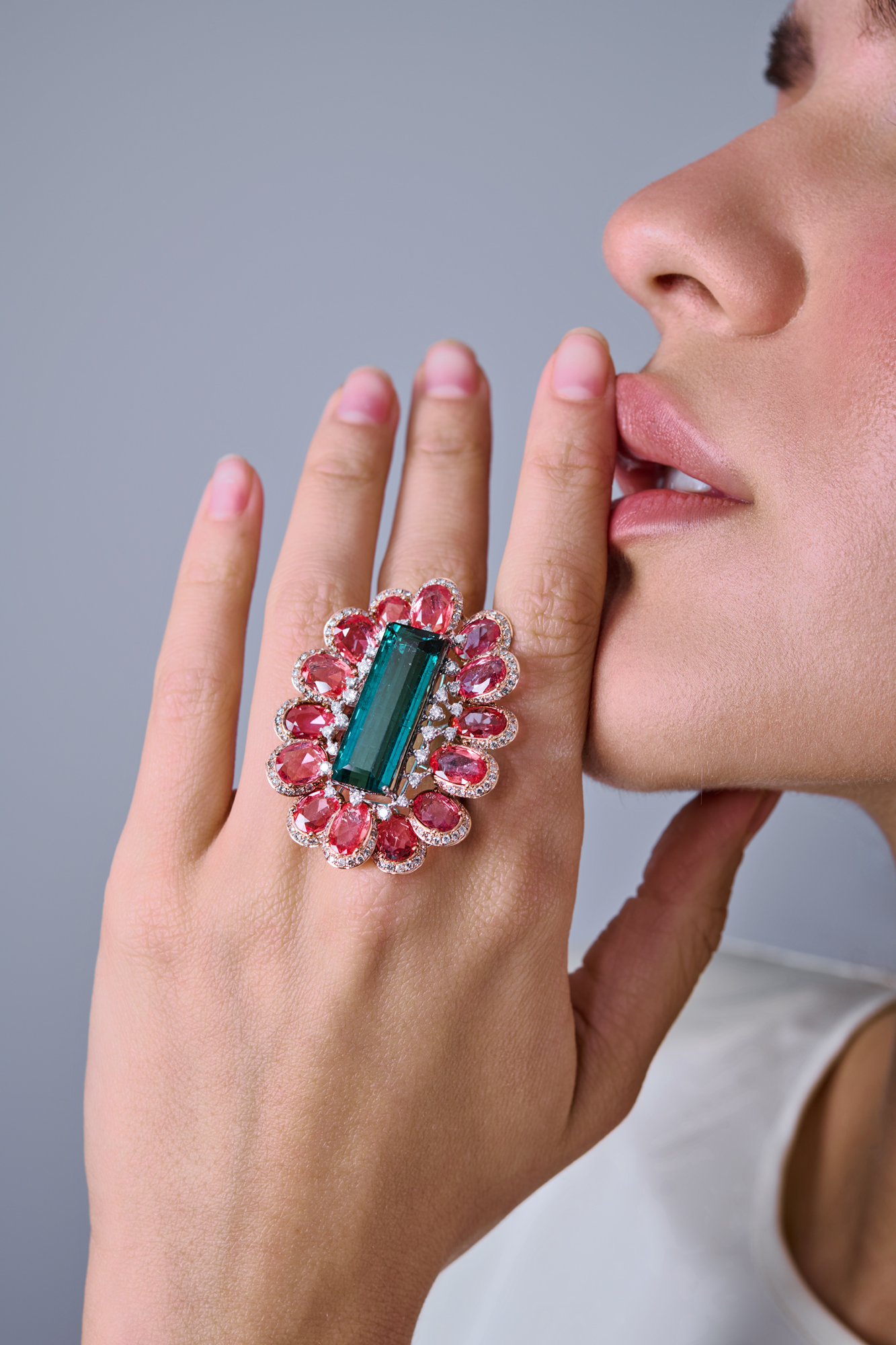 Кольцо "Cocktail Ring" выполнено из белого золота 750 пробы с 1 зеленым турмалином форма огранки "Багет" массой 9,76 ct и 14 персиковыми турмалинами формы огранки "Овал" массой 9,66 ct. 228 бриллиантов классической формы огранки общей массой 2,08 ct. Размер кольца - 17,75 (56). Вес - 20,67 гр.