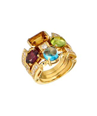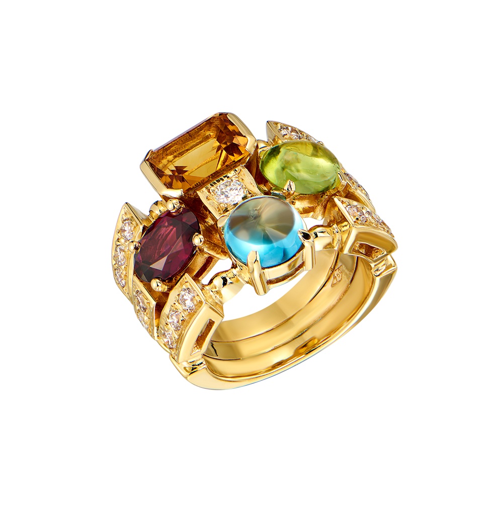 Кольцо в стиле Bvlgari коллекции "Allegra" выполненное из желтого золота 585 пробы с турмалином, топазами, перидотом, цитрином и бриллиантами классической формы огранки. Размер кольца - 17,0 (54) . Вес - 20,99 гр.