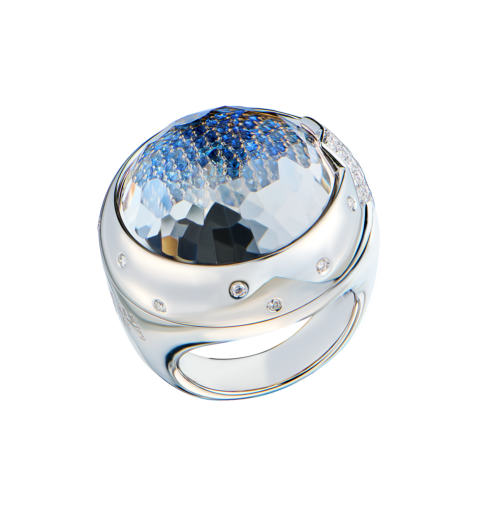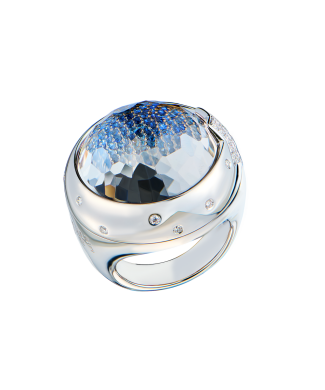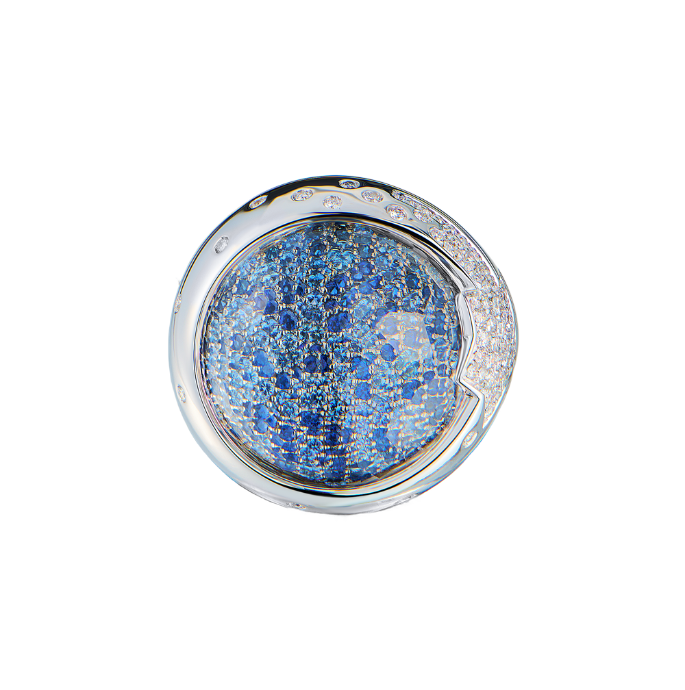 Кольцо Pasquale Bruni выполненное из белого золото 750 пробы с бриллиантами классической формы огранки общей массой 0,64 ct. и сапфирами формы огранки "Круг" общей массой 1,18 ct. и белым кварцем. Диаметр кольца - 26 х 25,7 мм. Размер кольца - 17,5 (55). Вес - 33,42 гр.