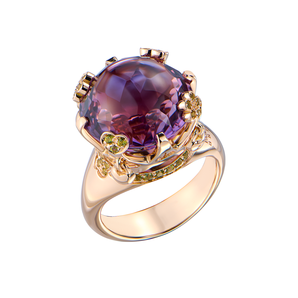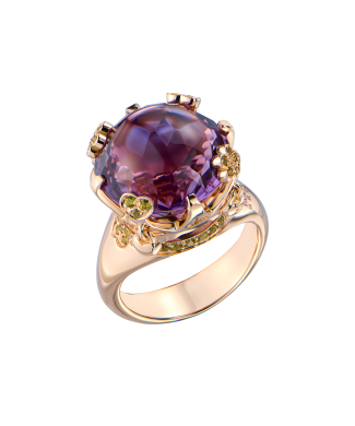 Кольцо Pasquale Bruni коллекции "Sissi" выполненное из розового золота 750 пробы с аметистом массой 13,5 ct., и зелеными хризолитами. Размер - 16,5 (52). Вес - 13,0 гр.