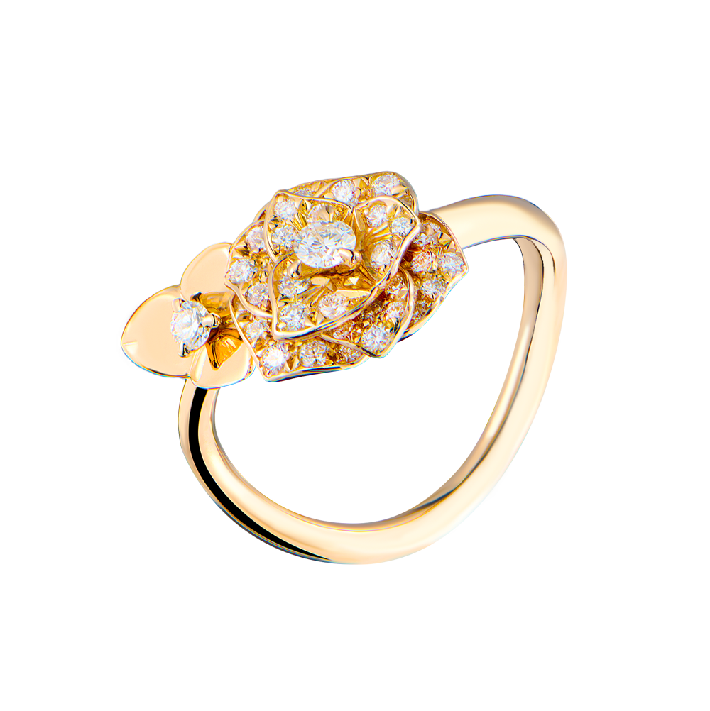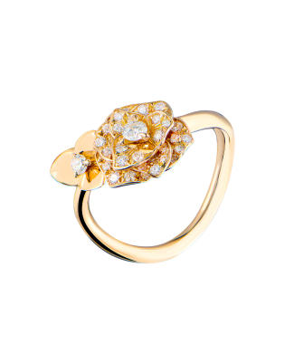 Кольцо Piaget коллекции "Rose" выполненное из желтого золота 750 пробы с бриллиантами. 31 бриллиант классической формы огранки общей массой 0,50 ct. Размер кольца - 16,5 (52). Вес - 5,01 гр.