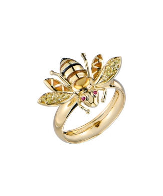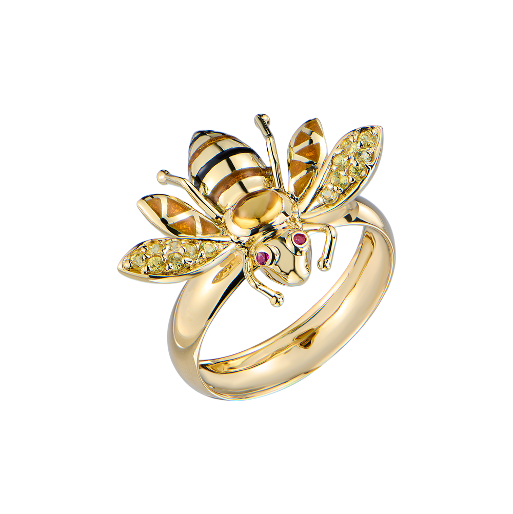 Кольцо Roberto Bravo выполненное из желтого золота 585 пробы с 16 сапфирами массой 0,10 ct., 1 турмалином массой 0,25 ct., а также вставками из эмали. Размер кольца - 17,5 (55). Вес - 4,47 гр. Документы.