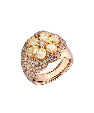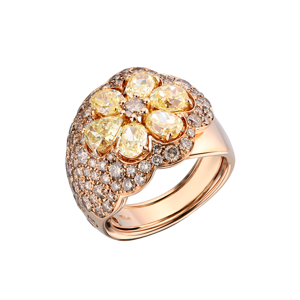 Кольцо выполненное из розового золота 750 пробы с бриллиантами фантазийной и классической формы огранки общей массой 4,49 ct. 2 природных бриллиант формы огранки "Груша" массой 0,90 ct. Цвет - Light Yellow. Чистота - SI1. 4 природных бриллиантоa формы огранки "Овал" общей массой 1,33 ct. Цвет - Light Yellow. Чистота - SI1. 1 природный бриллиант классической круглой формы огранки общей массой 0,13 ct. Цвет - Light Brown. Чистота - SI1. 72 природных бриллианта классической круглой формы огранки массой 2,13 ct. Цвет - Light Brown. Чистота - SI1. ширина 18,0 мм. Размер кольца - 17,0 (54). Вес - 13,72 гр.