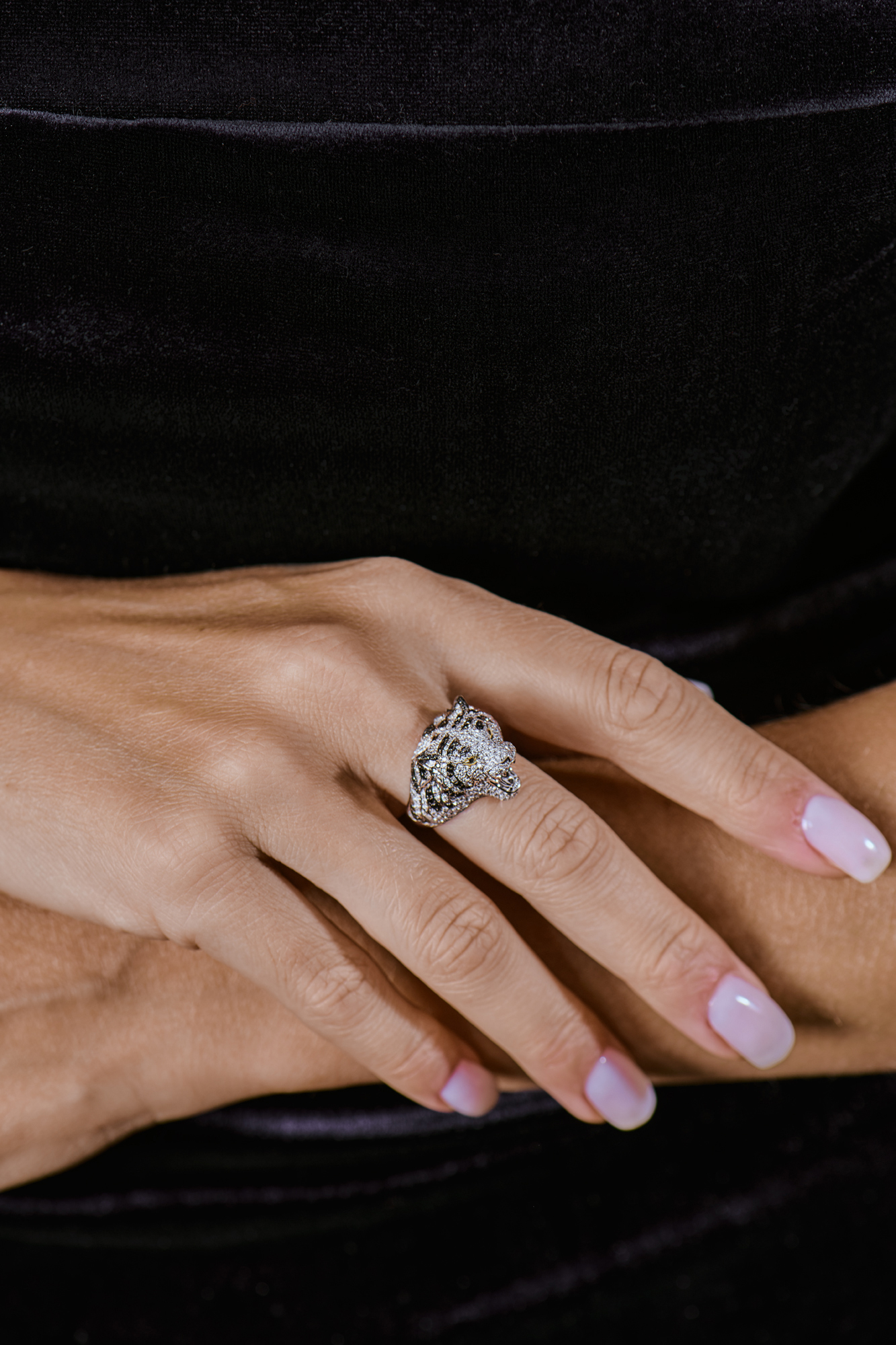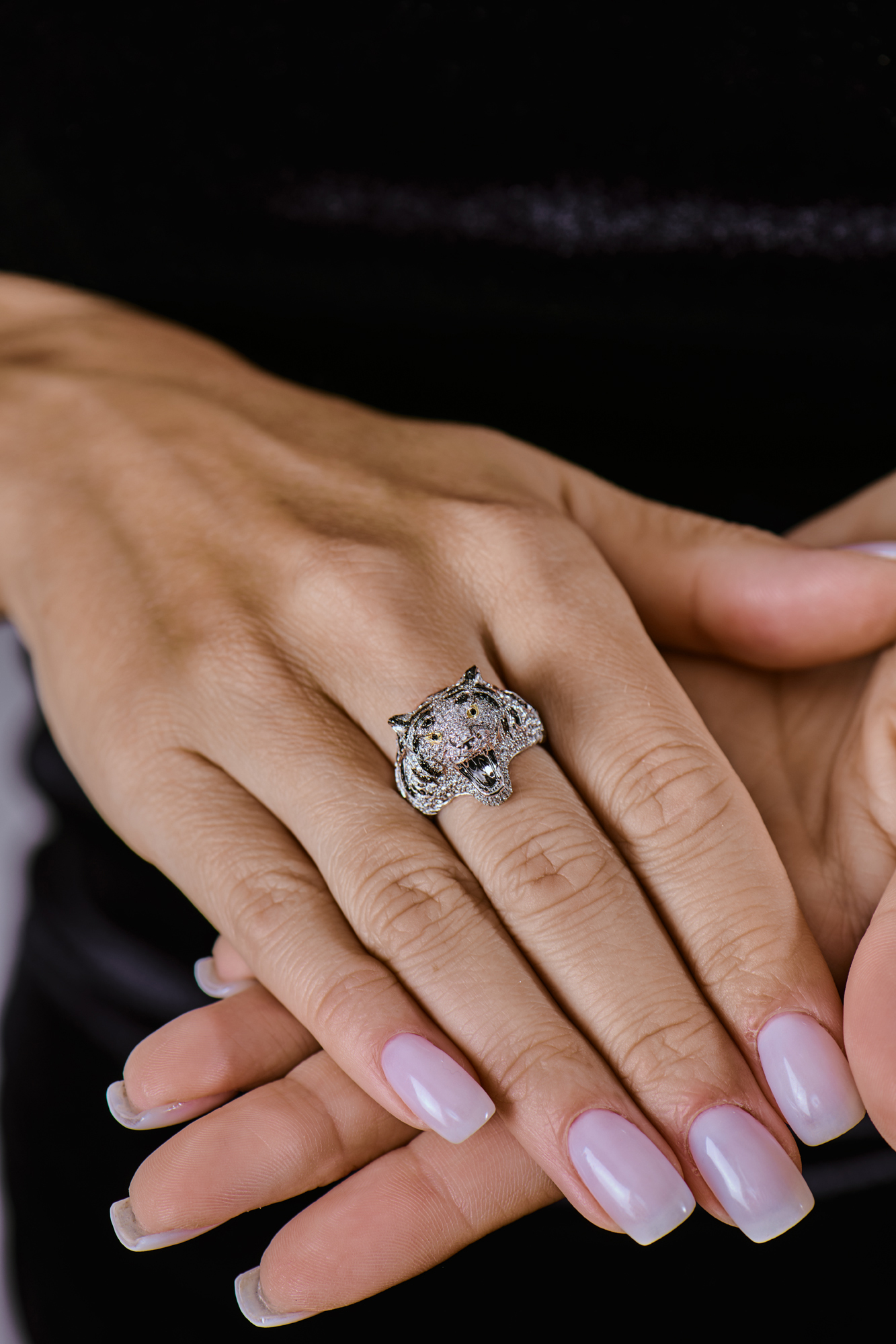 Кольцо от бренда Roberto Coin, входит в коллекцию Animalier, которая известна своими украшениями, вдохновленными животными. Конкретно это изделие называется "Siberian Tigers" и посвящено силе и красоте сибирских тигров. Украшение выполнено из белого золота 750 пробы и инкрустировано бриллиантами, а глаза тигра, как правило, сделаны из черных бриллиантов. Размер кольца - 17,0 (54). Вес - 12,20 гр.