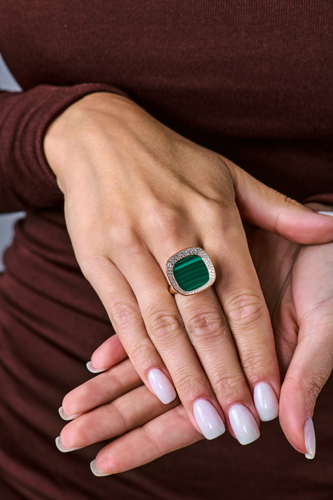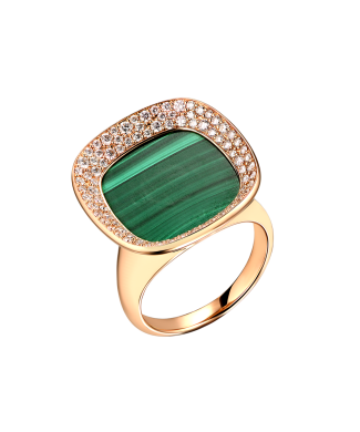 Кольцо Roberto Coin коллекции "Carnaby Street" выполненное из розового золота с малахитом, окруженный бриллиантовым паве общей массой 0,65 ct. Размер 20,0 х 20,2 мм. Размер кольца 16,75 (53). Вес 10,43 гр.