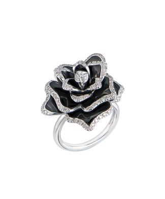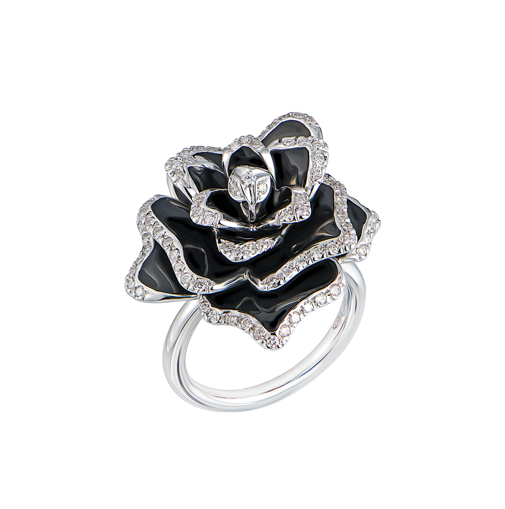 Кольцо Roberto Coin коллекции "Flower Omega" выполненное из белого золота 750 пробы лепестки этого художественного кольца украшены черной эмалью. По краям лепестков расположены бриллианты весом 0,46 ct. На нижнем лепестке также можно различить рубин массой 0,01 ct в оправе. Размер кольца 17,0 (54). Вес - 14,04 гр.