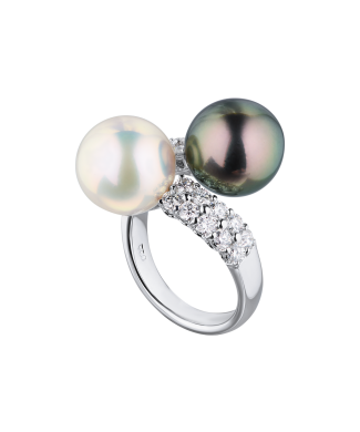 Кольцо Schoeffel выполненное из белого золота 750 пробы с 20 бриллиантами классической формы огранки общей массой 1,08 ct. Жемчуг Южных морей: Диаметр: 11,8 мм. Морской жемчуг Таити. Диаметр: 11.5 мм. Размер кольца - 17,0 (54). Вес - 10,83 гр.