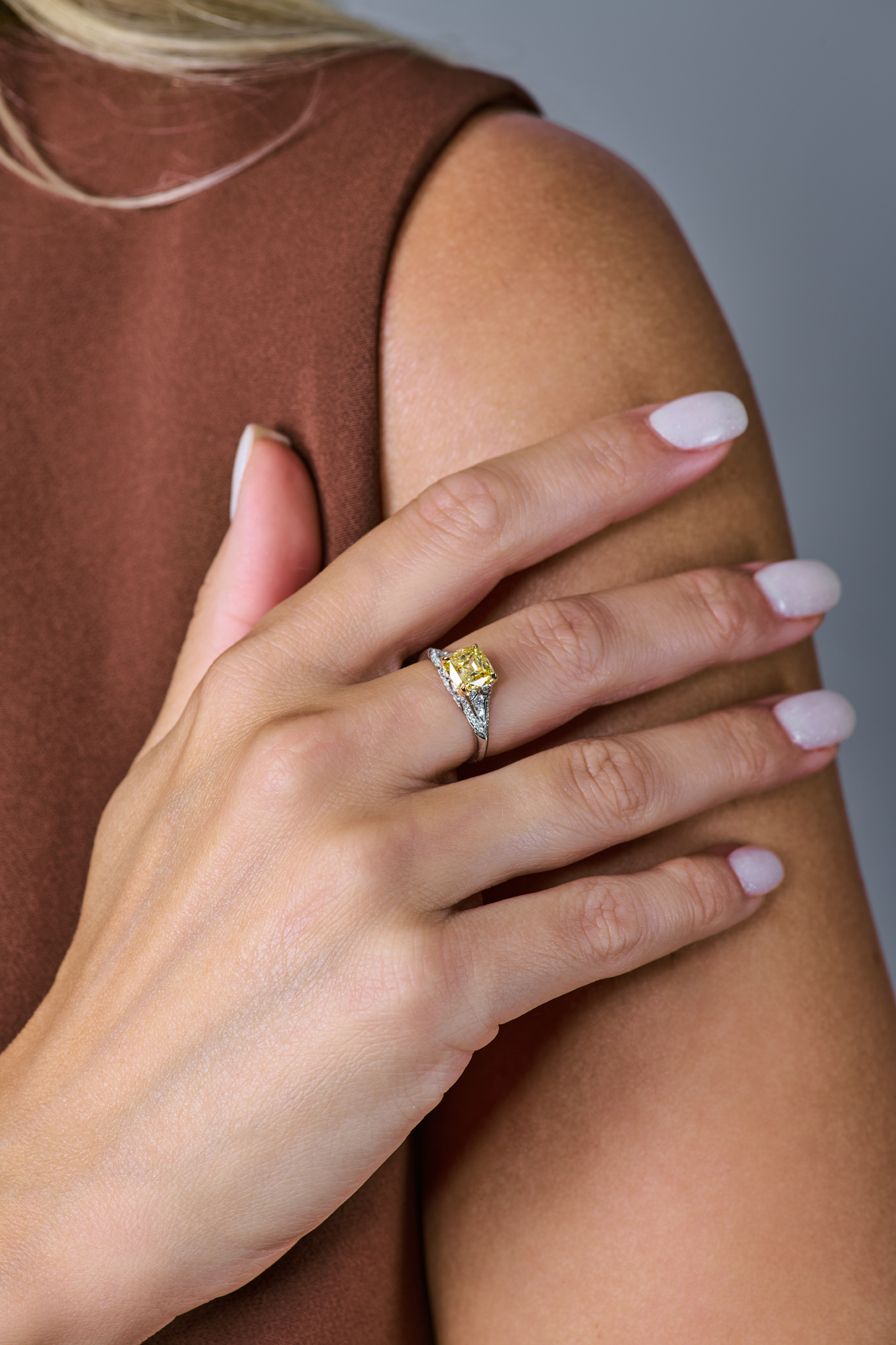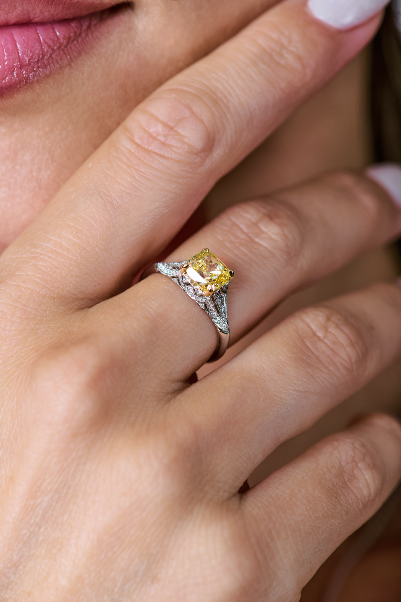 Кольцо Tiffany & Co выполненное из платины 950 пробы и желтого золота 750 пробы с бриллиантом формы огранки "Square Antique" массой 2,05 ct. Цвет - Fancy Intense Yellow. Чистота - VS1. 64 бриллианта классической формы огранки общей массой 0,29 ct. Размер кольца - 16,5 (52). Вес - 3,40 гр. Размер кольца можем изменить по Вашему желанию.