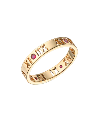 Кольцо Tiffany & Co коллекции "Atlas" выполненное из желтого золота 750 пробы с 5 рубинами классической формы огранки. Ширина кольца - 3,5 мм. Размер - 16,75 (53). Вес - 2,98 гр.