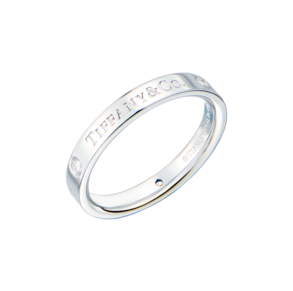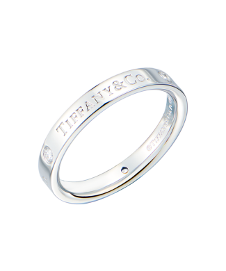 Обручальное кольцо Tiffany & Co выполненное из платины 950 пробы с 3 бриллиантами классической формы огранки 0,07 ct. Ширина кольца 3 мм. Размер - 17,0 (54). Вес - 5,65 гр.