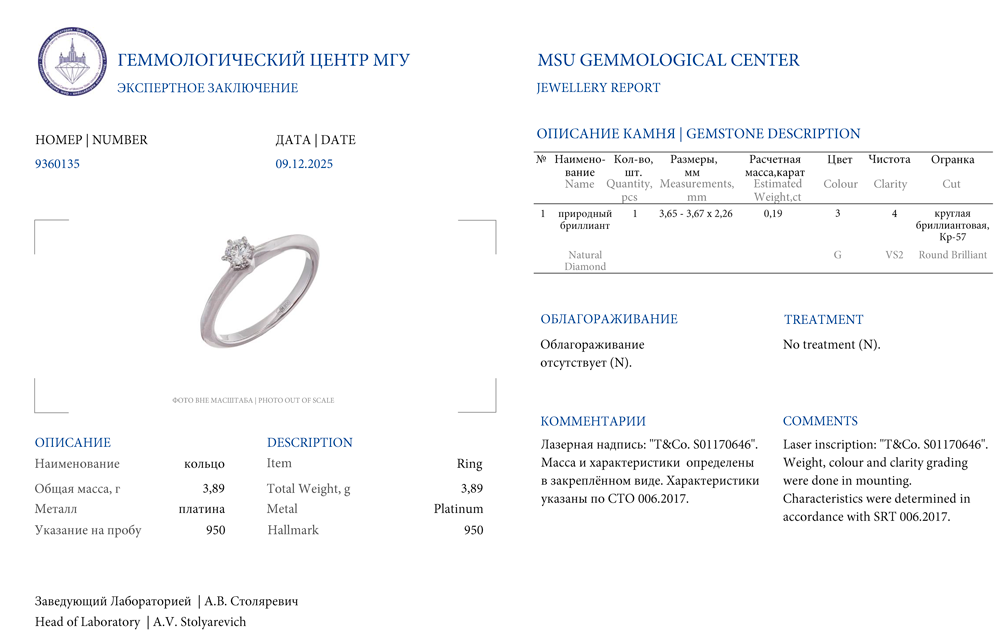 Кольцо Tiffany & Co выполненное из платины 950 пробы с бриллиантом классической формы огранки "Кр-57" массой 0,19 ct. Цвет - G. Чистота - VS2. Размер кольца - 16,25 (51). Вес - 3,89 гр. В комплекте прилагается сертификат экспертное заключение Геммологического центра МГУ. Размер кольца можем изменить по Вашему желанию.