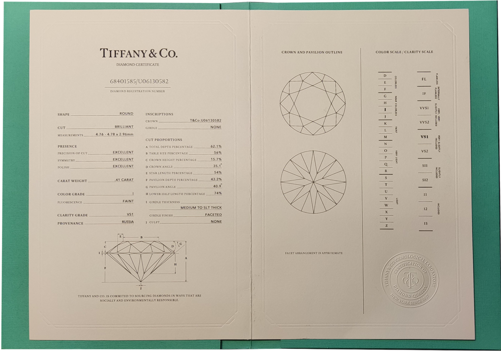 Кольцо Tiffany & Co выполненное из платины 950 пробы с бриллиантом классической формы огранки "Кр-57" массой 0,41 ct. Цвет - I. Чистота - VS1. Качество огранки- Excellent. Качество полировки - Excellent. Симметрия - Excellent. Размер кольца - 15,0 (47). Вес - 3,86 гр. Полный комплект. Размер кольца можем изменить по Вашему желанию.