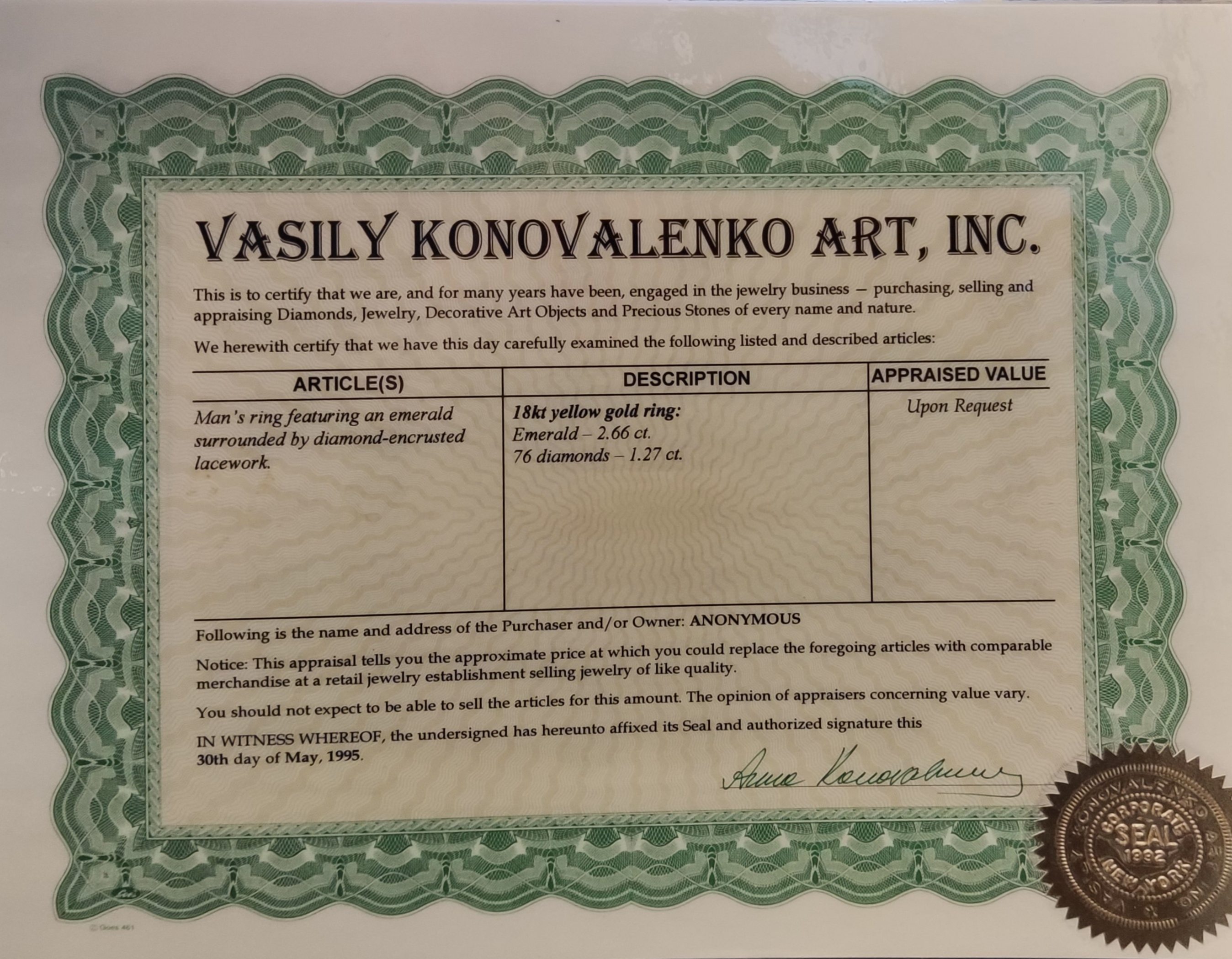 Кольцо из желтого золота 750 пробы с 1 изумрудом "Изумрудной" формы огранки общей массой 2,66 ct и паве из 76 бриллиантов классической формы огранки общей массой 1,27 ct. Размер 19,75 (62). Вес - 13,87 гр. Полный комплект.