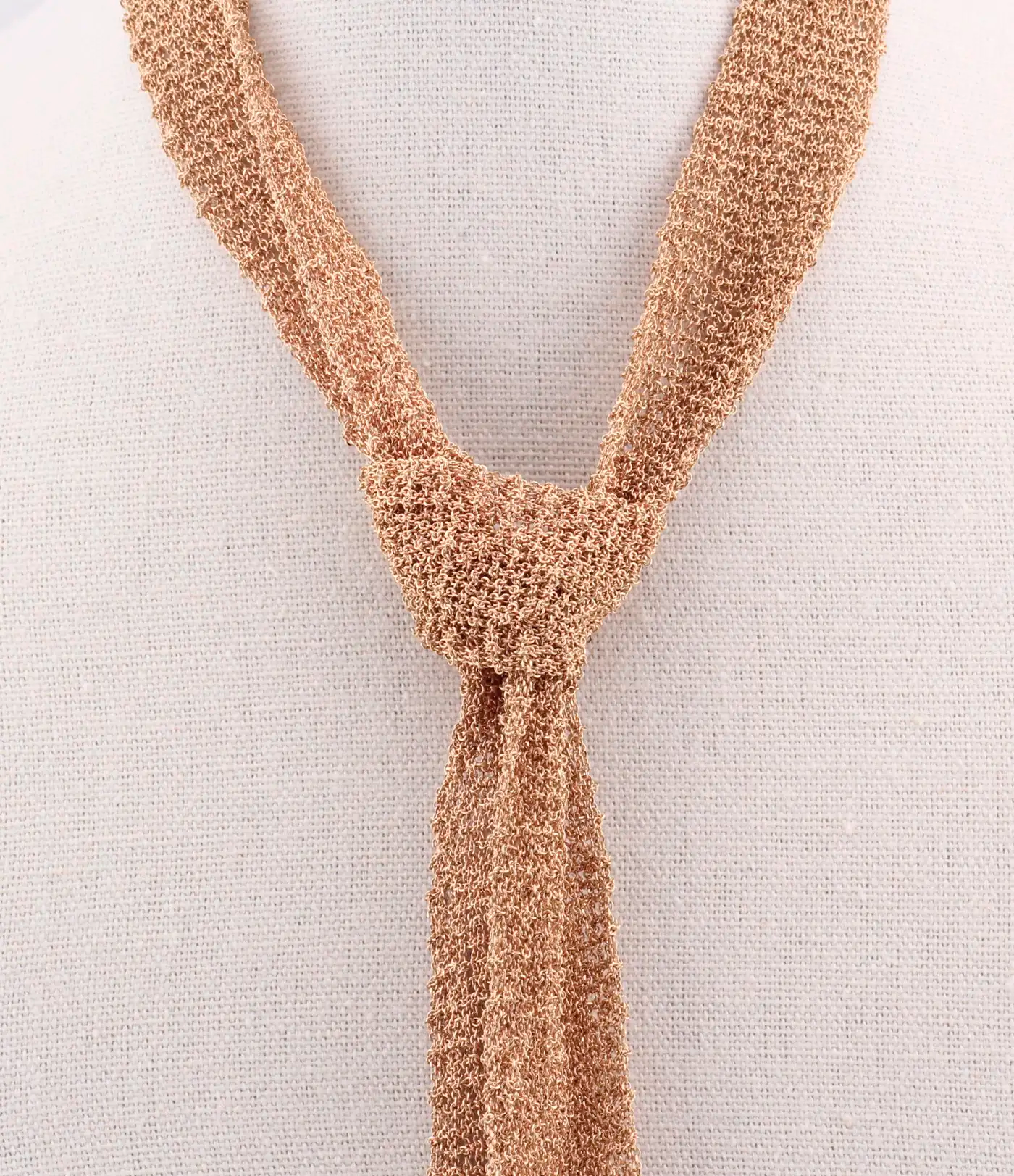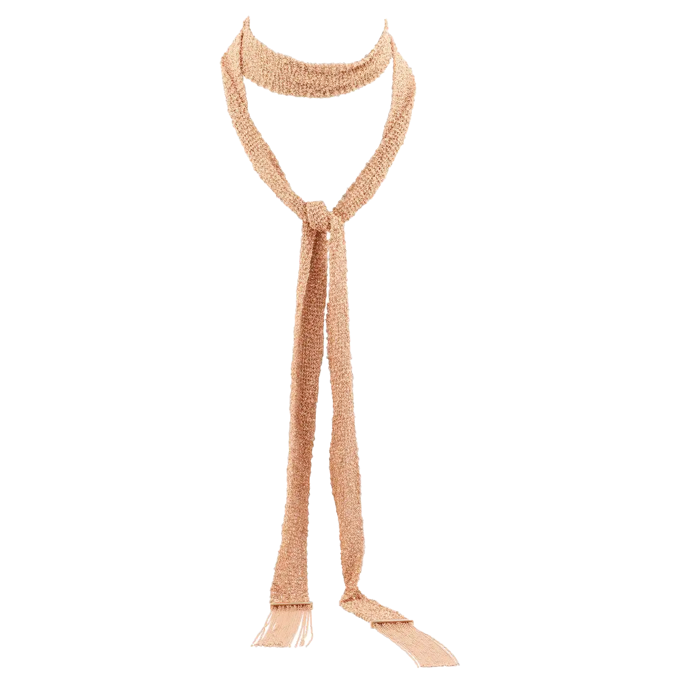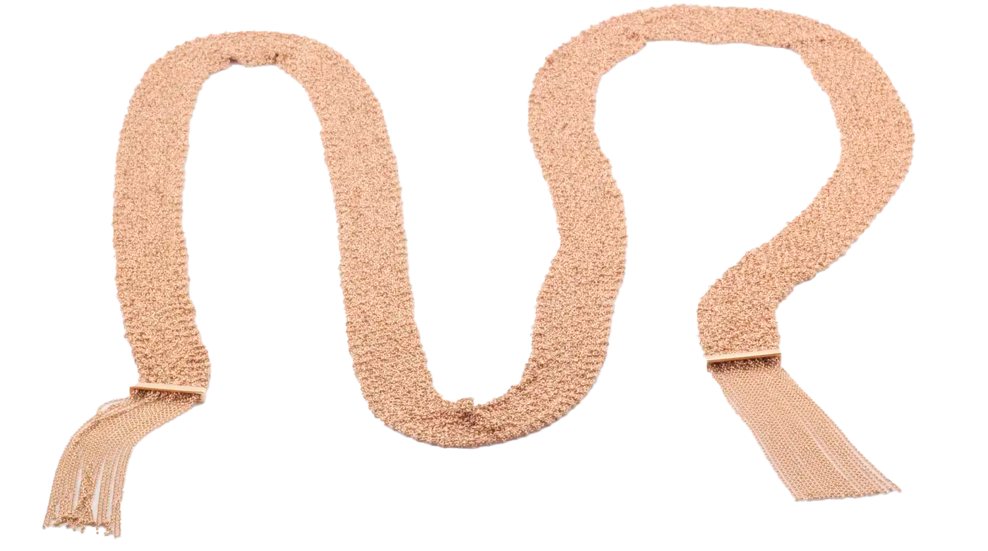 Колье Boucheron коллекции "Delilah" из розового золота 750 пробы, состоит из широкой полосы, элегантно обвивающей шею, и изящно завязанной подвески. Длина : 120 см. Вес: 144,5 граммов.