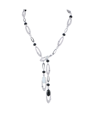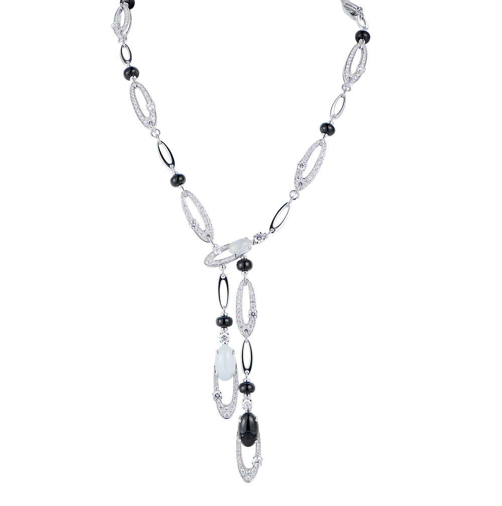 Колье Bvlgari коллекции "Elisia" из белого золота 750 пробы с бриллиантами классической формы огранки общей массой 6,15 ct. ониксами и халцедонами формы огранки кабошон. Длина изделия - 40 см. Вес - 44,70 гр.