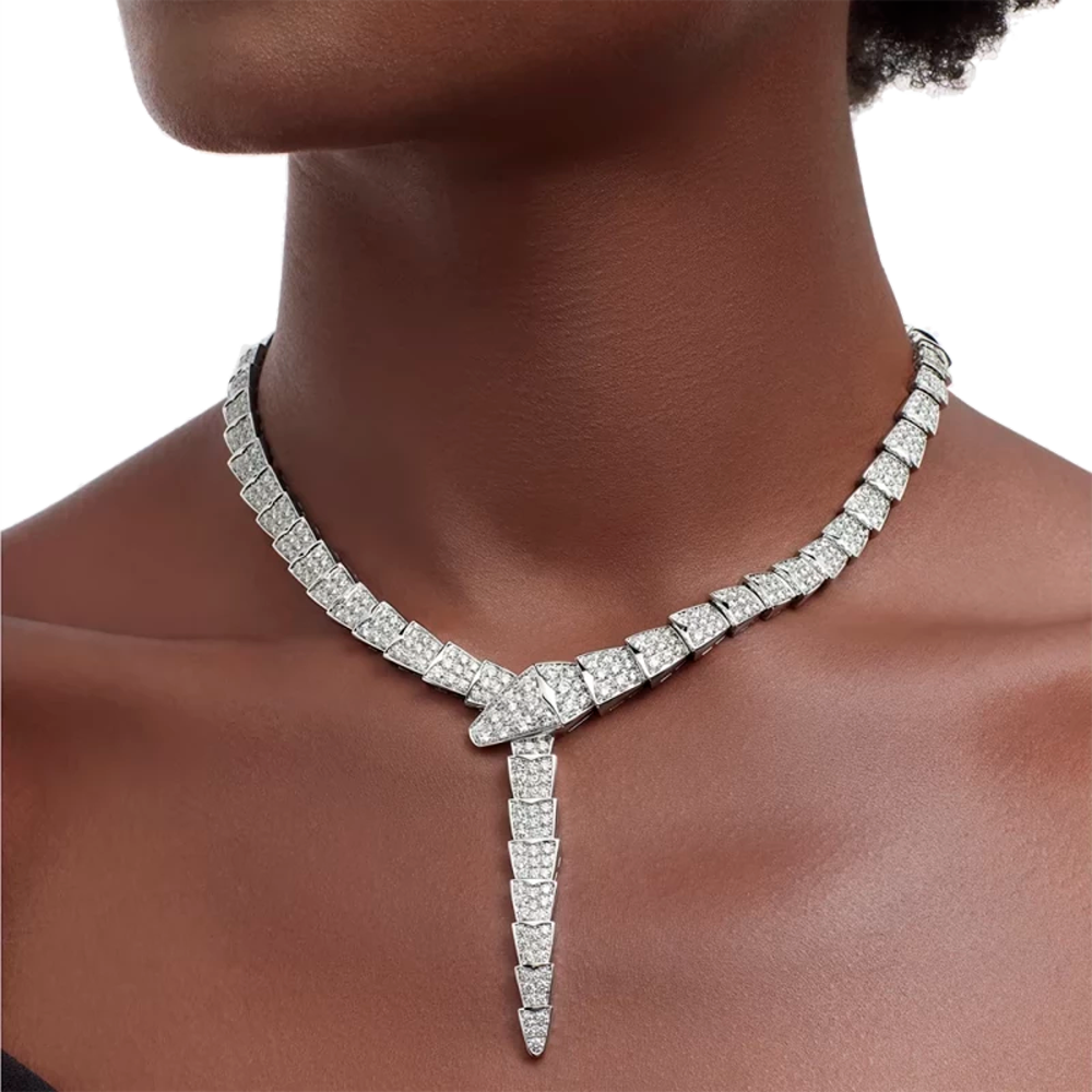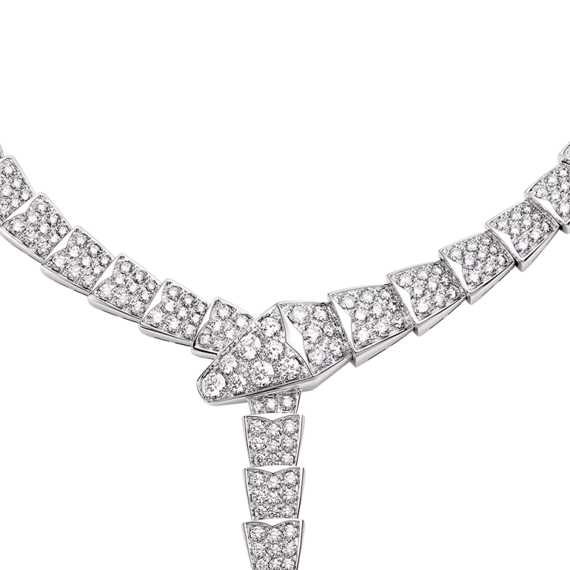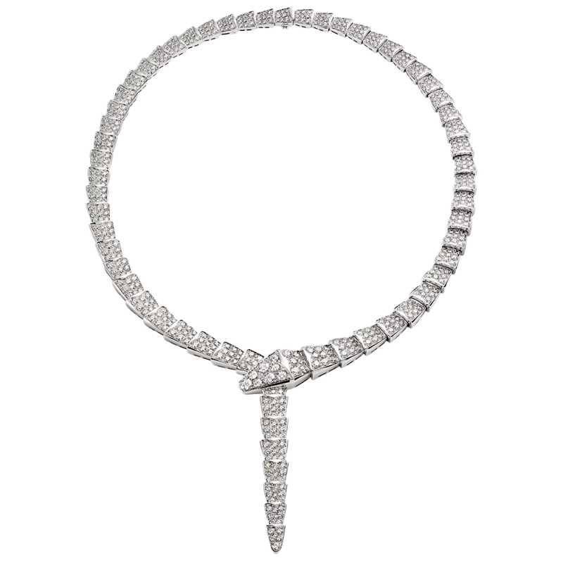 Колье Bvlgari коллекции "Serpenti" выполнено из белого золота 750 пробы с бриллиантовым паве общей массой 14,74 ct. Размер 39 см. Вес - 90,64 гр. Полный комплект. Новое.