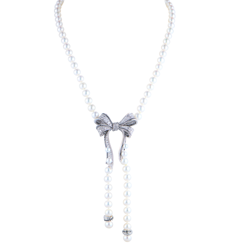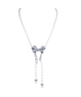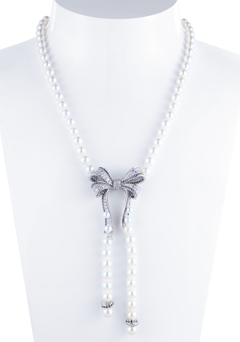 Колье Chanel коллекции "Boucles de Camelia" выполненное из белого золота 750 пробы, украшенное белыми и черными бриллиантами классической формы огранки и жемчугом Акойя диаметром 5,5 мм. Длина колье - 38 см. Вес - 37,37 гр.