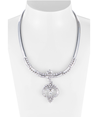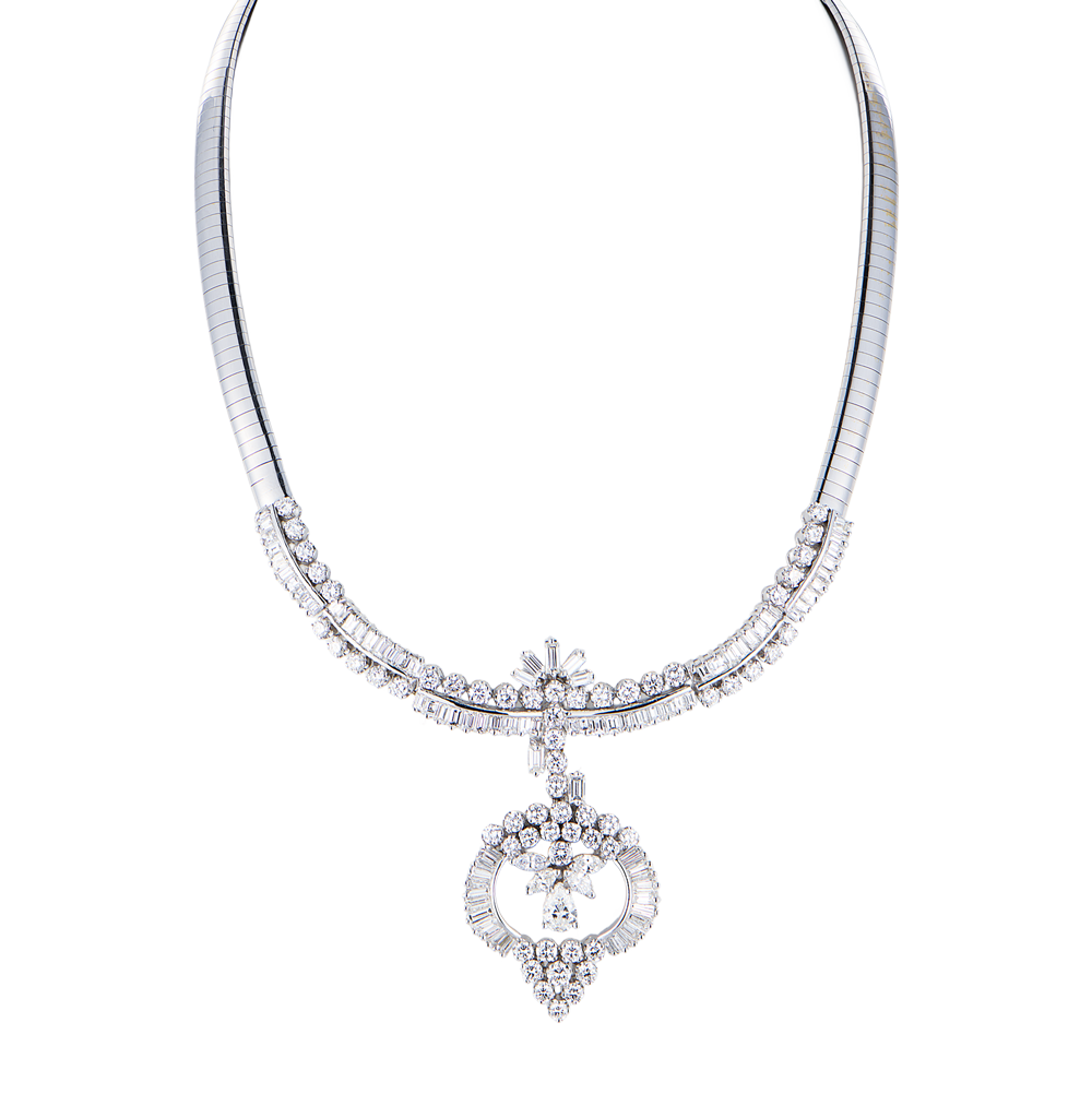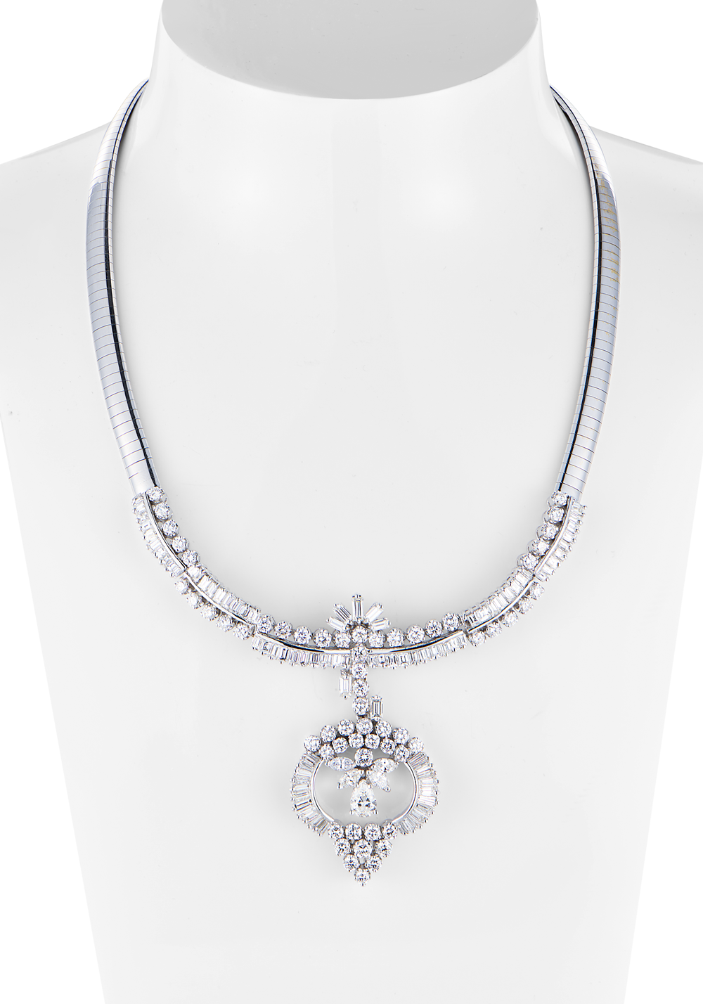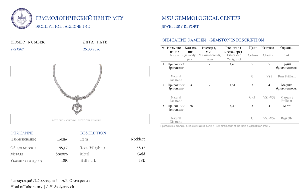 Колье выполненное из белого золота 750 пробы с бриллиантами. 59 бриллиантов классической формы огранки общей массой 4,60 ct. Цвет 3 (G-H). Чистота 4 (VS1-VS2). 88 бриллиантов формы огранки "Багет" общей массой 5,30 ct. Цвет 3 (G). Чистота 4 (VS1-VS2). 4 бриллианта формы огранки "Маркиз" общей массой 0,51 ct. Цвет 3 (G). Чистота 4 (VS1-VS2). 1 бриллиант формы огранки "Груша" общей массой 0,65 ct. Цвет 3 (G-H). Чистота 4 (VS1). Длина колье 40,0 см. Вес - 58,17 гр. В комплекте экспертное заключение Геммологического центра МГУ.