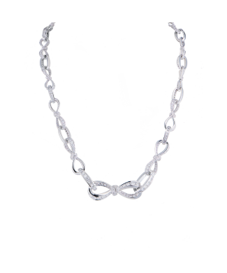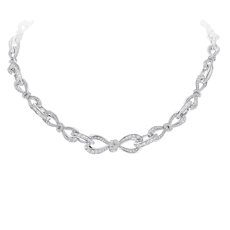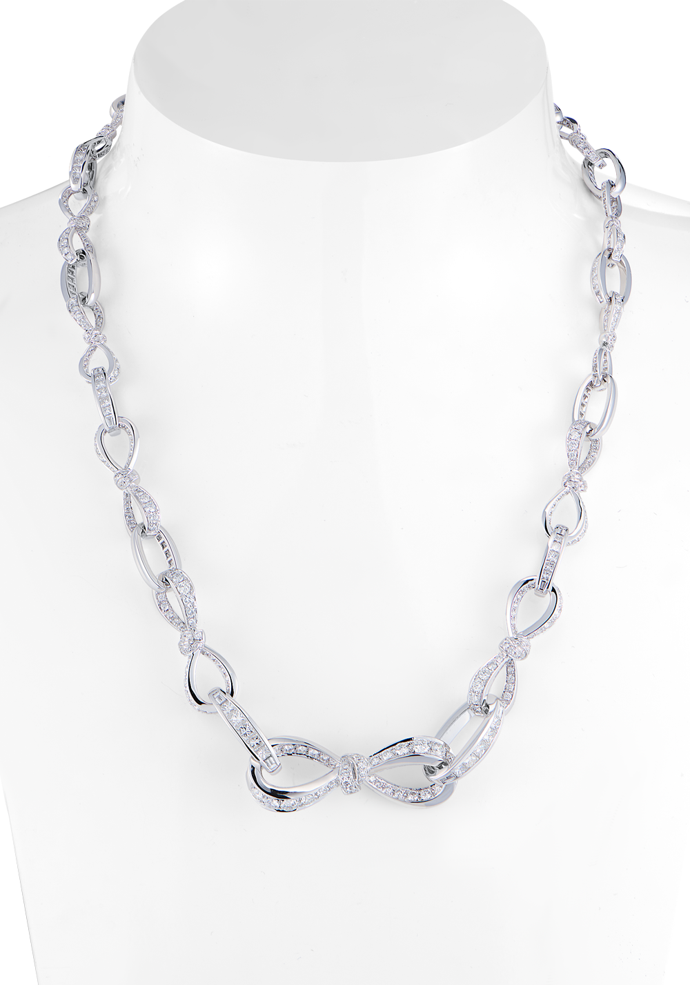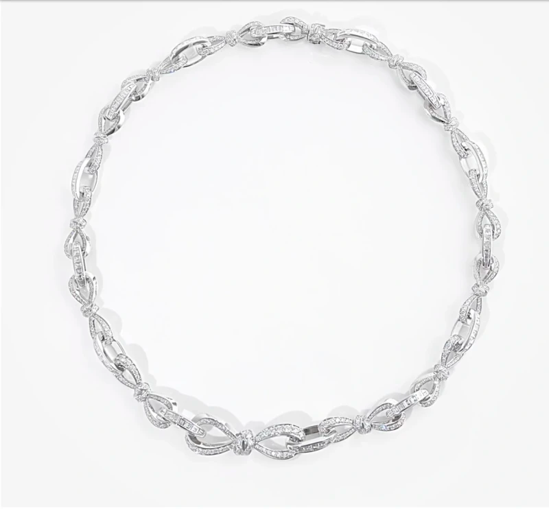 Колье выполненное в стиле GRAFF, коллекции "Tilda's Bow Diamond Link" из белого золота 750 пробы и бриллиантами. 574 бриллианта классической формы огранки "КР-57", "Принцесса" и "Багет" общей массой 8,53 ct. Цвет G-I. Чистота VS-SI. Длина колье 42 см. Вес - 44,84 гр.