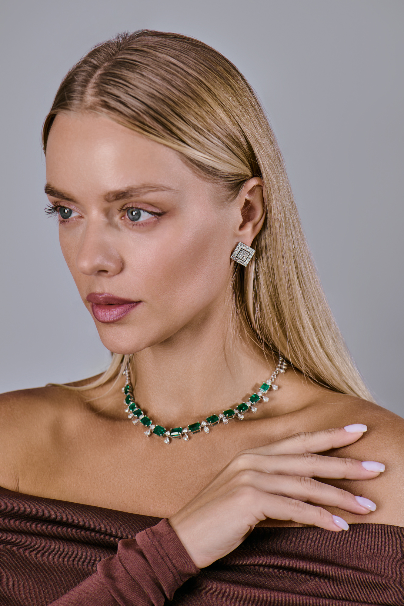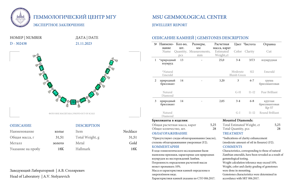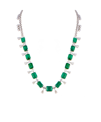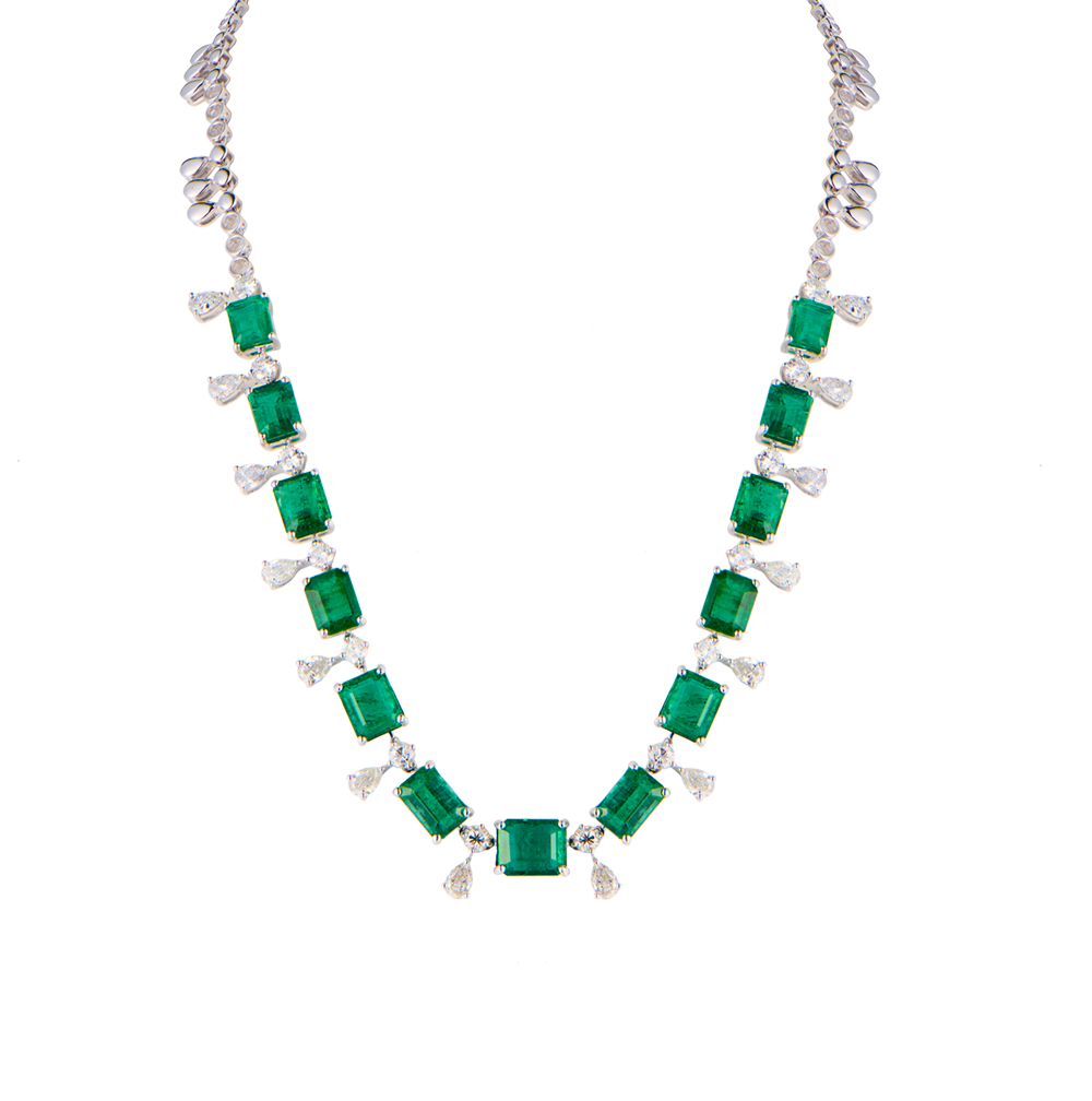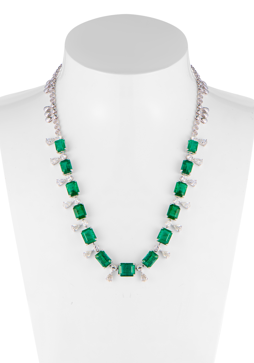 Колье выполненное из белого золота 750 пробы с изумрудами и бриллиантами. Изумруды формы огранки "Изумрудная" массой 25,0 ct. Цвет - Moderate Bluish Green (3-4). Чистота - SI2 (3/Г3) . 14 бриллиантов классической формы огранки "Кр-57" массой 2,05 сt. (G-I/I1-I2). 14 бриллиантов формы огранки "Груша" общей массой 3,20 ct. (G-H/I1-I2). Длина колье - 40 см. Вес - 31,28 гр. В комплекте прилагается экспертное заключение Геммологического центра МГУ.
