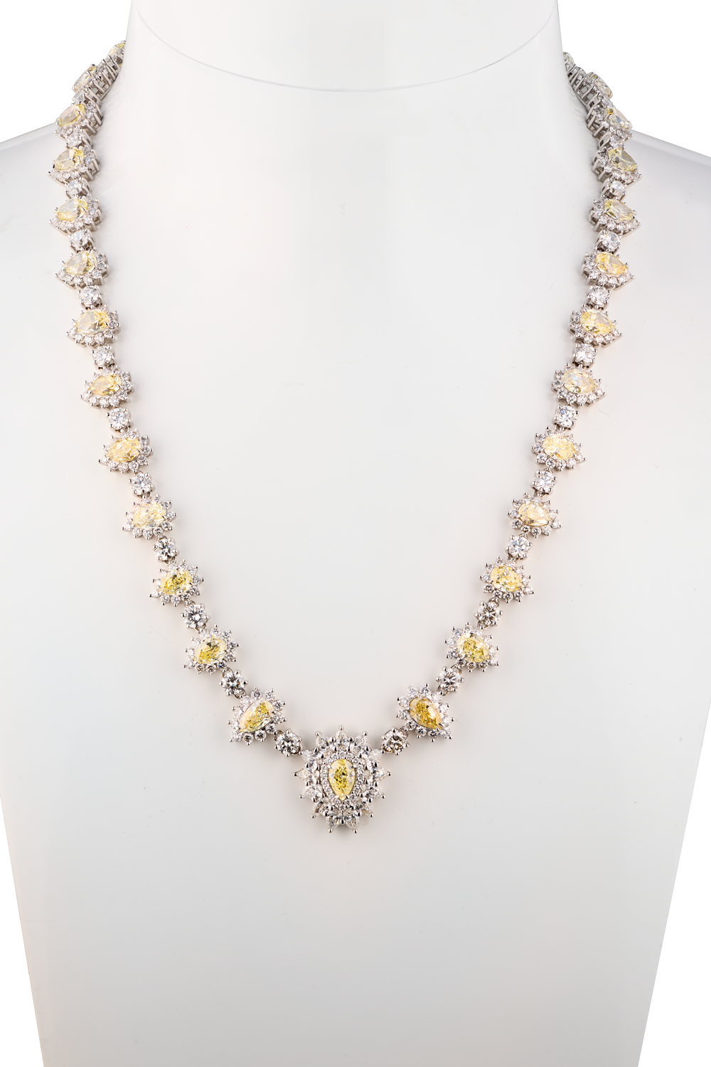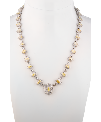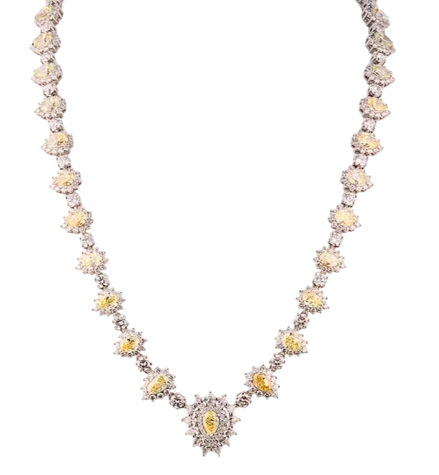 Колье Yanush Gioielli выполненное из белого золота 750 пробы и бриллиантами. 1 бриллиант классической формы огранки общей массой 0,50 ct. F/VVS1. 32 бриллианта формы огранки "Груша" общей массой 16,39 ct. Fancy Yellow/VS1. 13 бриллиантов формы огранки "Груша" общей массой 1,36 ct. F/VS1. 42 бриллианта классической круглой формы огранки общей массой 6,78 ct. F/VS1. 359 бриллиантов классической круглой формы огранки общей массой 8,24 ct. E-F/VVS. Длина колье 40 см. Вес - 44,90 гр. В комплекте оригинальные документы. Новый.
