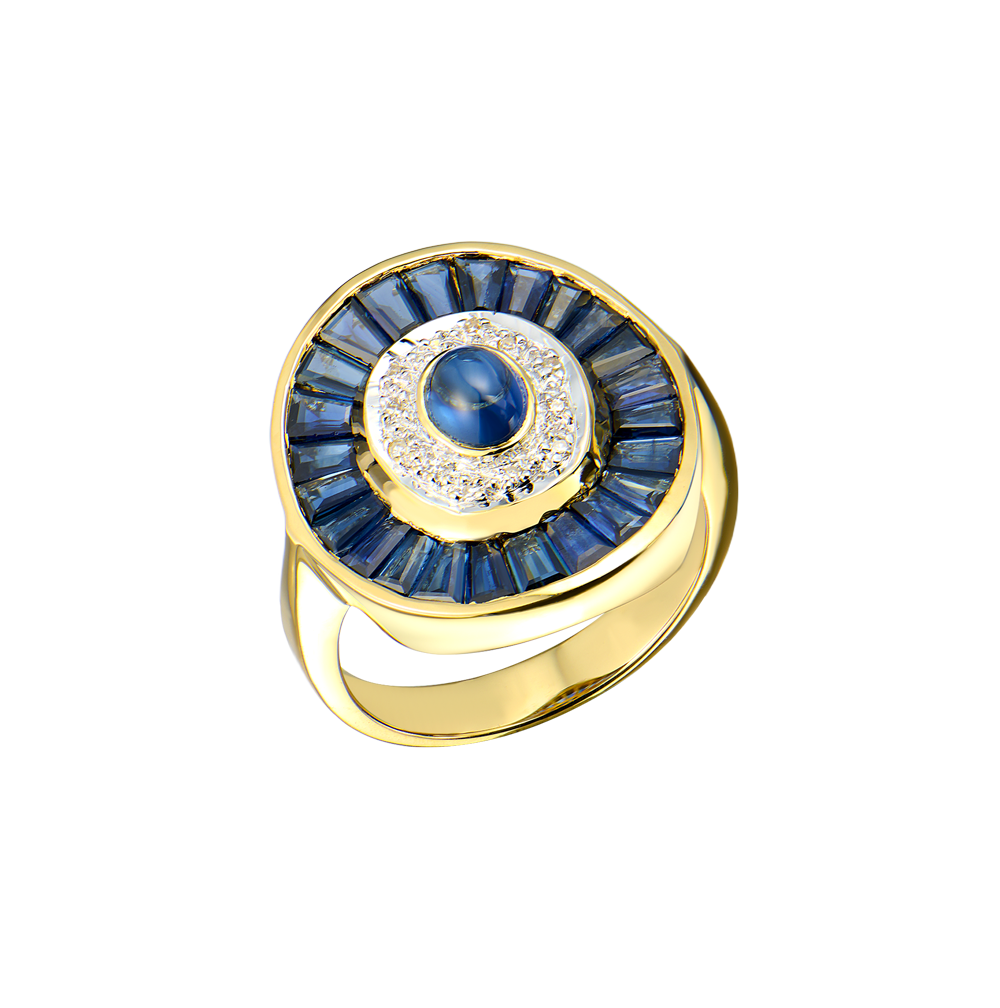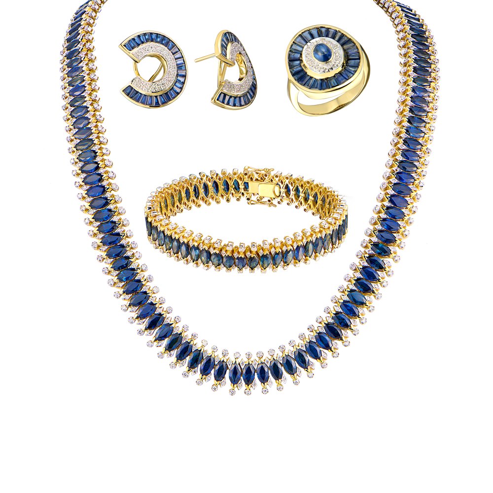Комплект Vasily Konovalenko выполненный из желтого золота 750 пробы с бриллиантами и сапфирами.