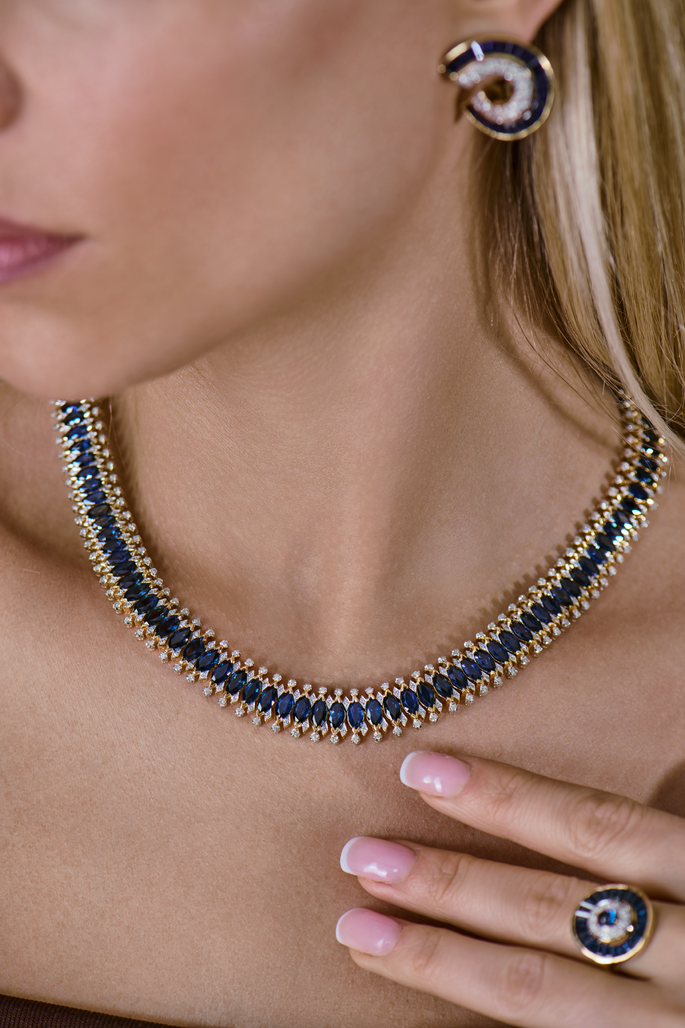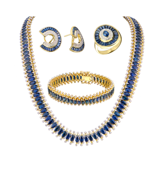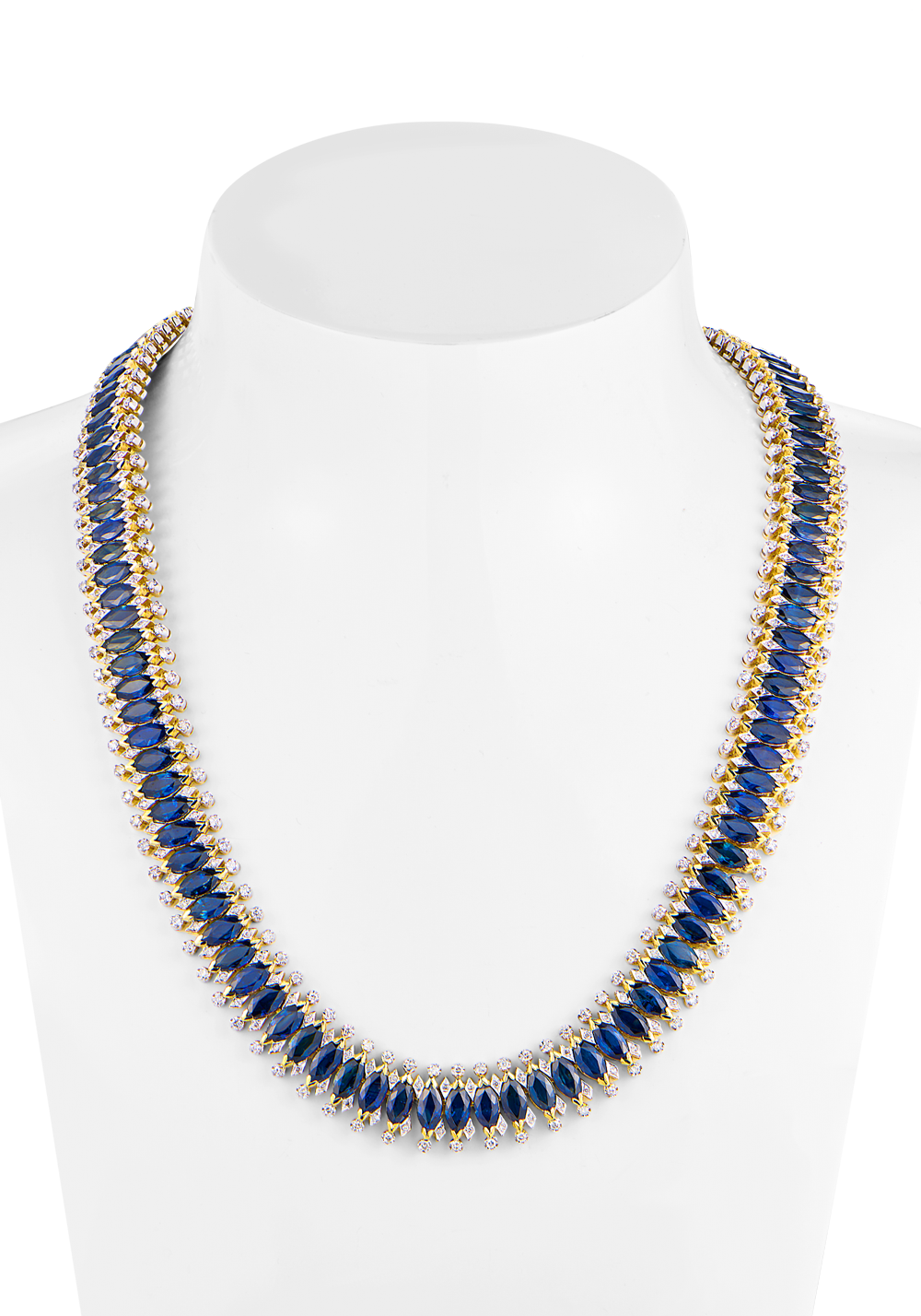 Колье из желтого золота 750 пробы с 110 природными сапфирами общей массой 61,90 ct. Цвет Dark-Blue (Темно-синий). Форма огранки - "Маркиз". 440 бриллиантов классической формы огранки "Кр-57" общей массой 4,45 ct. Длина колье - 44 см. Вес -113,68 гр.