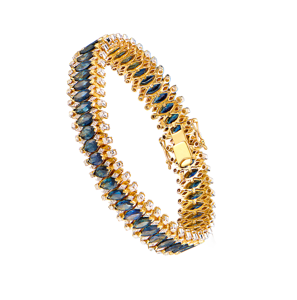 Браслет из желтого золота 750 пробы с 48 природными сапфирами общей массой 26,79 ct. Цвет Dark-Blue (Темно-синий). Форма огранки - "Багет". 192 бриллианта классической формы огранки "Кр-57" общей массой 1,98 ct. Размер браслета - 18,0 см длина 1,3 см ширина. Вес - 51,77 гр.