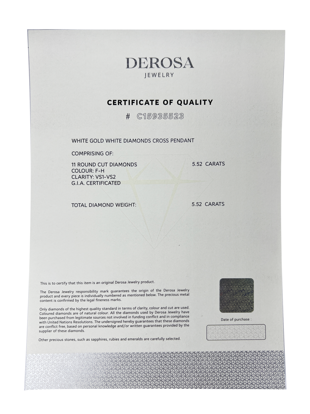 Крестик DeRosa большая модель, выполненная из белого золота 750 пробы с 11 бриллиантами классической огранки цветов F - G - H, чистоты VS1 - VS2, общей массой 5,52 ct. Размер крестика 18 х 38 мм. Длина цепочки - 48 см (регулируется). Вес -16,52 гр. Абсолютно новый! Полный комплект бутика. С 11 сертификатами GIA к каждому камню! 7476728693, 1485280438, 7456061130, 5486213960, 1489183154, 3485213385, 1487216348, 2484306729, 7396061184, 6475115169, 1468563271.