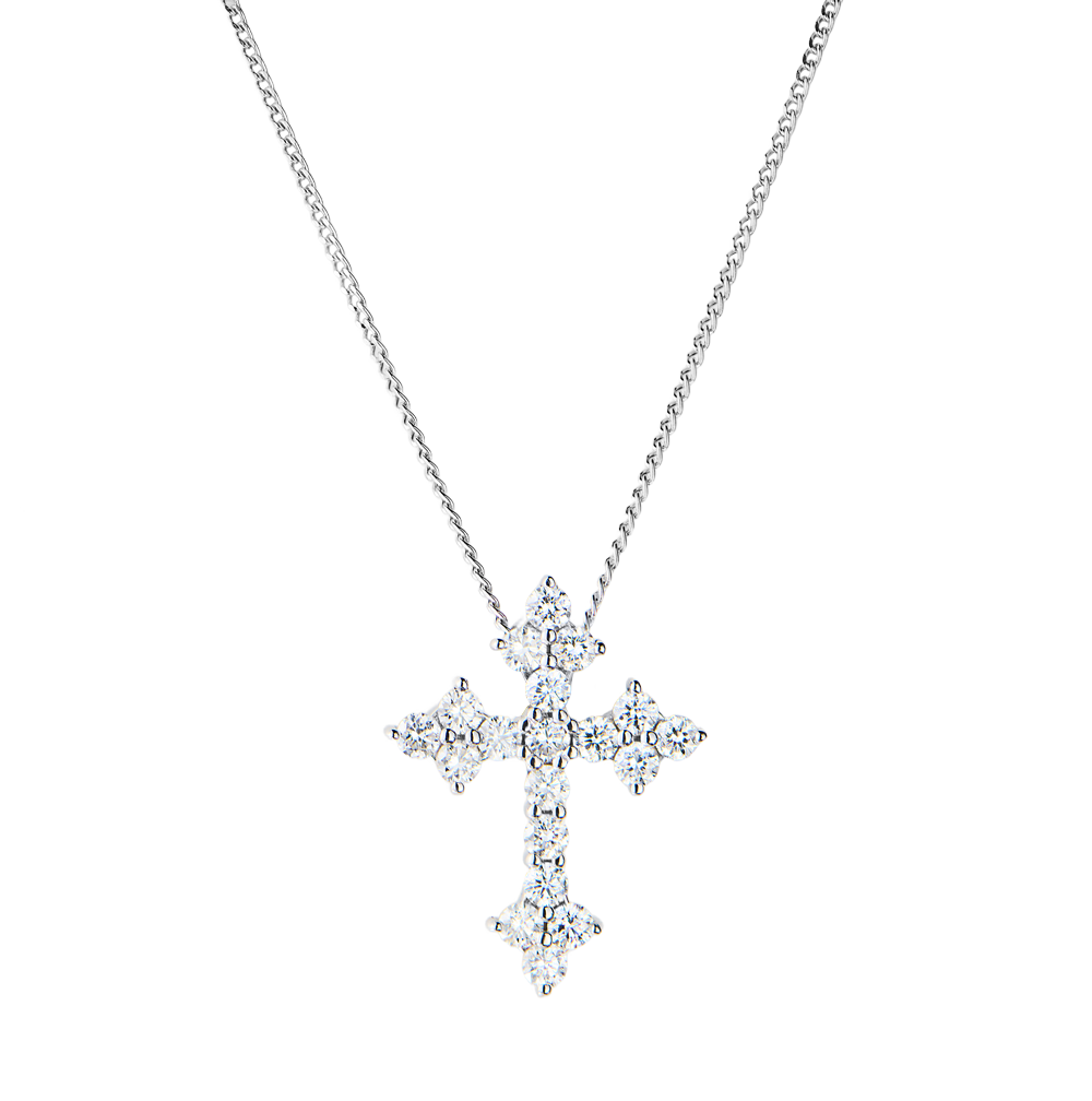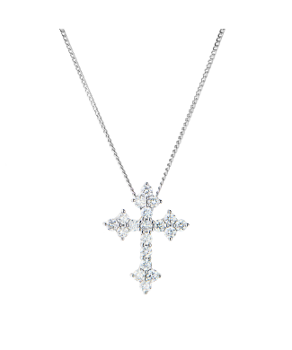 Крестик выполненный из белого золота 585 пробы с бриллиантами, цепочка выполнена из белого золота 750 пробы. 19 бриллиантов классической формы огранки "Кр-57" массой 0,40 ct. Цвет - H. Чистота - VS2. Размер 18 х 13 мм. Длина цепочки - 49 - 53 см. Вес - 2,78 гр.