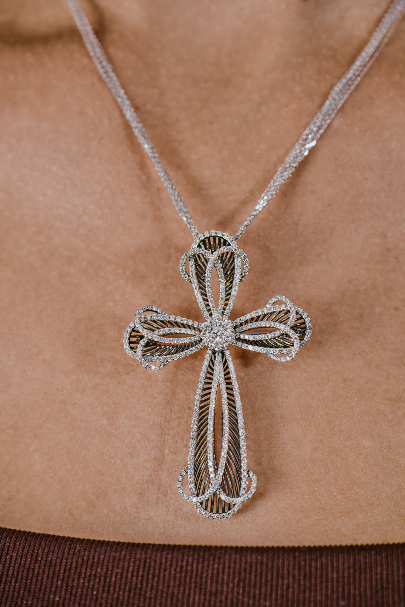 Подвеска - брошь - крест Oro Vitchenza выполненная из черненого золота 750 пробы с паве из бриллиантов классической формы огранки "Кр-57" общей массой 3,01 ct. Цвет G. Чистота VS. Размер крестика 40 х 60 мм. Длина цепочки - 40 см. Вес - 16,79 гр.
