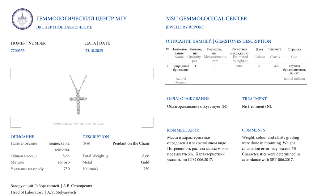 RalfDiamonds крестик большого размера, выполненный из белого золота 750 пробы с 11 бриллиантами классической формы огранки общей массой 2,05 ct. Цвета F-G (3). Чистоты VS2 (4-5). Размеры крестика 28 х 20 мм. Длина цепочки - 46 см. (регулируется). Вес - 8,66 гр. В комплекте прилагается экспертное заключение Гемологического центра МГУ.