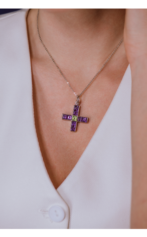 Крест RalfDiamonds выполненный из белого золота 750 пробы с 6 аметистами общей массой 5,15 ct и 1 хризолитом 0,75 ct. Размер крестика 29 х 28 мм. Длина цепочки - 38 см. Вес - 13,25 гр. Полный комплект.