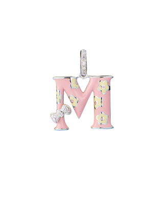 Фирменный шарм Aaron Basha с инициалом "М" выполнен из белого золота 750 пробы покрытый розовой и бежевой эмалью украшен бантом с 14 бриллиантами общей массой 0,08 ct. Размер шарма 18 х 16 мм. Вес изделия - 6,20 гр.