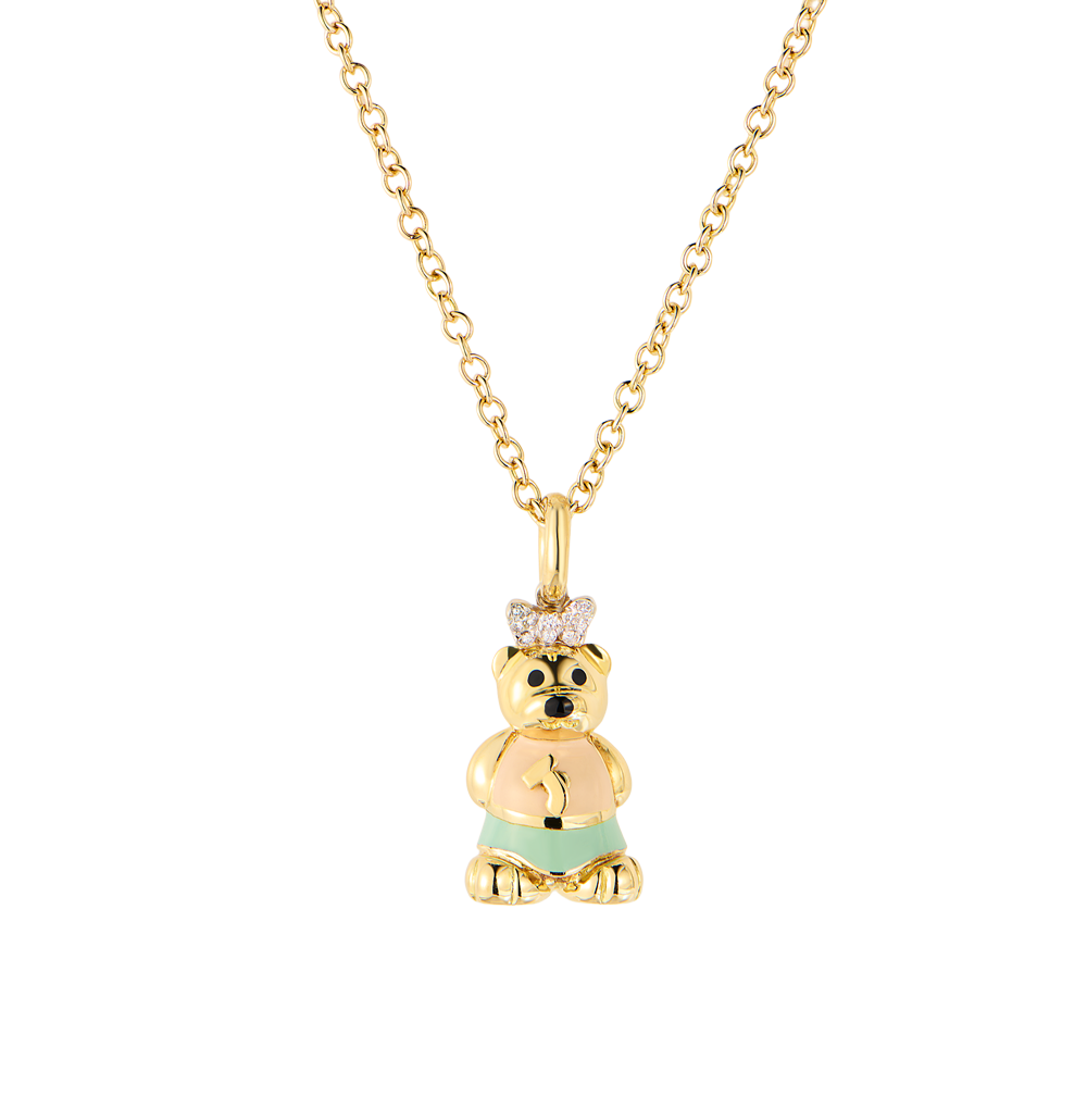 Подвеска Aaron Basha из коллекции "Teddy Bear" выполненная из желтого золота 750 пробы с эмалью и 10 бриллиантами классической формы огранки общей массой 0,08 ct. Медведь изображен в эмалированной рубашке с маркировкой в виде буквы «J», а также с бантом, украшенный бриллиантами. В комплекте цепочка 40 см. Шарм 22,5 х 13,5 мм. Общий вес - 15,12 гр.
