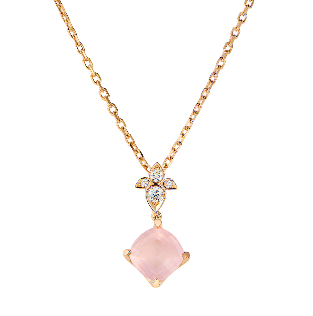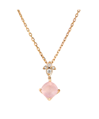 Подвеска Cartier коллекции "Indian Mysteries Lotus" выполнена из розового золота 750 пробы с розовым кварцем и 4 бриллиантами классической формы огранки общей массой 0,15 ct. Размер кулона 20 х 10 мм. Длина цепочки 40 см. Вес - 4,41 гр.
