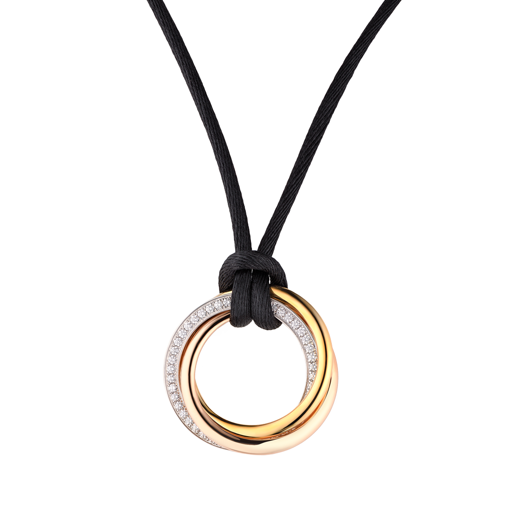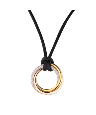 Подвеска Cartier коллекции "Trinity" выполненный из белого, желтого и розового золота 750 пробы с 48 бриллиантами классической формы огранки общей массой 0,38 ct. Внутренний диаметр: 19,4 мм. Длина шнурка 60см (регулируется). Вес 12,80 гр.