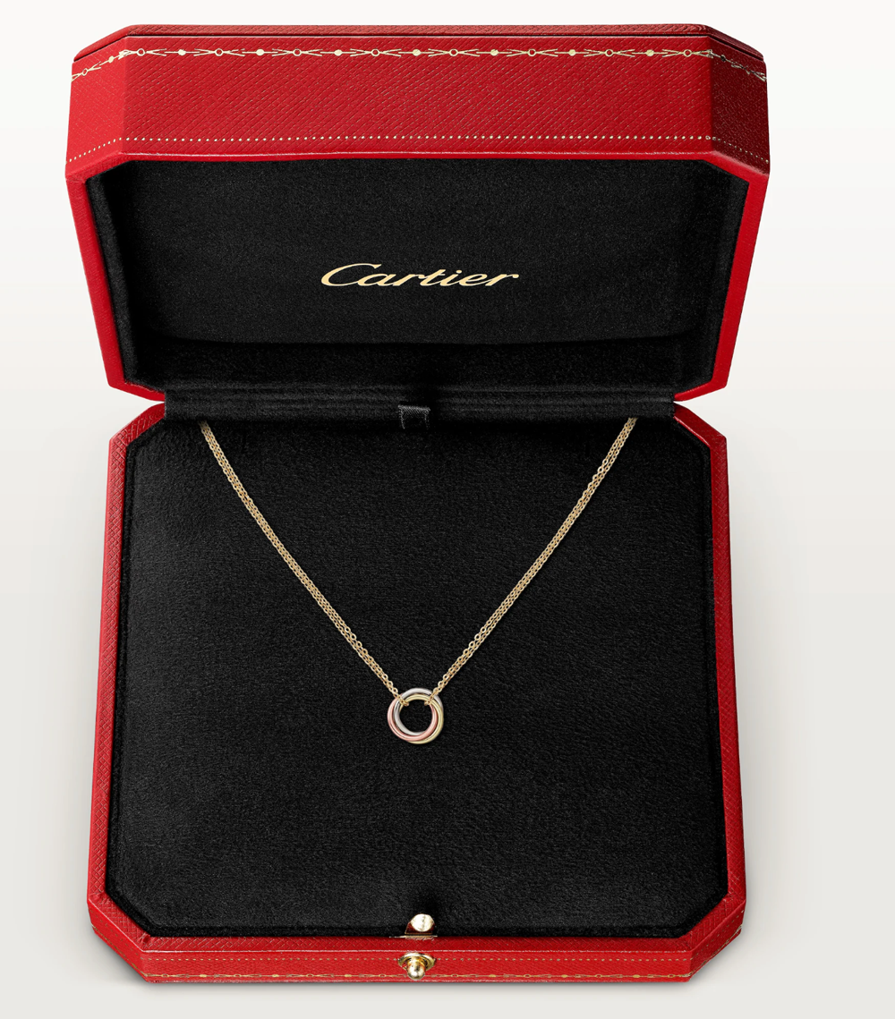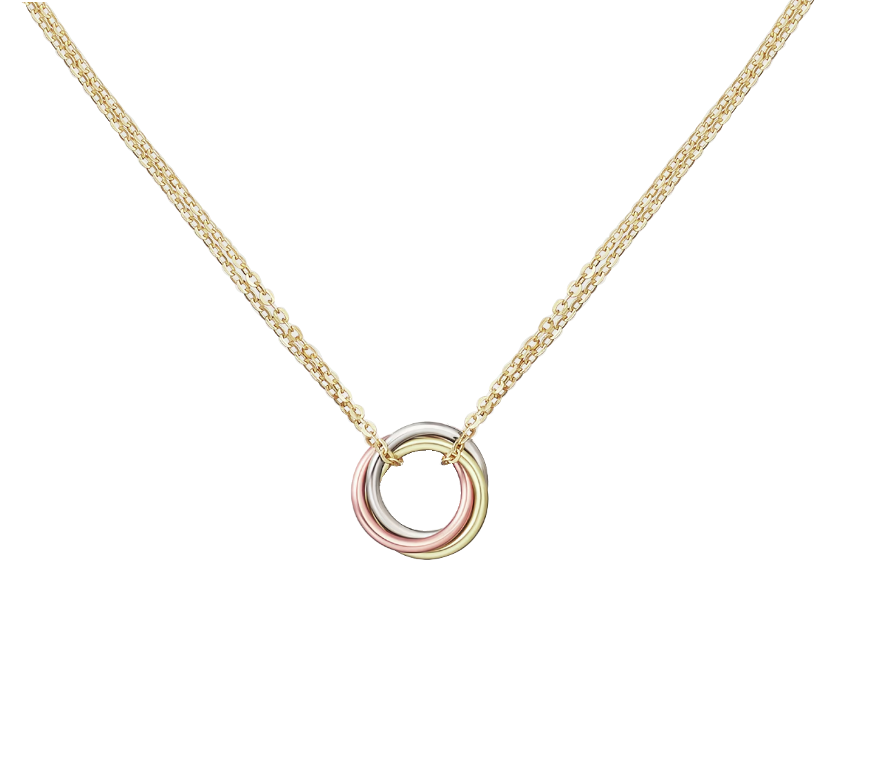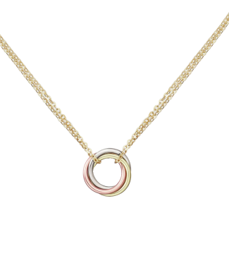Подвеска (колье) Cartier коллекции "Trinity de Cartier" выполненное из белого, желтого и розового золота 750 пробы. Длина цепочки - 38 см. Размер мотива - 10,7 мм. Вес изделия - 3,85 гр.