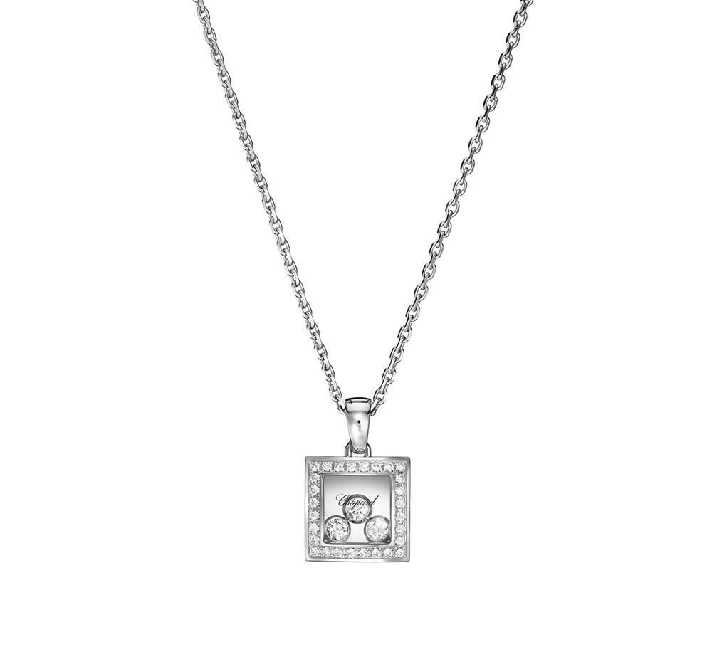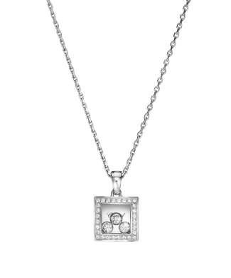 Подвеска Chopard коллекции "Happy Diamonds Happy Curves" выполненная из белого золота 750 пробы с бриллиантами. 28 бриллиантов классической формы огранки общей массой 0,15 ct. 3 плавающих бриллианта общей массой 0,13 ct. Длина цепочки - 42 см (регулируется). Вес - 9,00 гр. Полный комплект. Новая.
