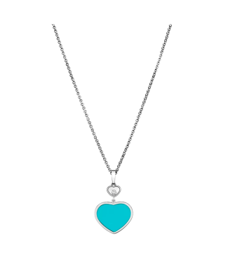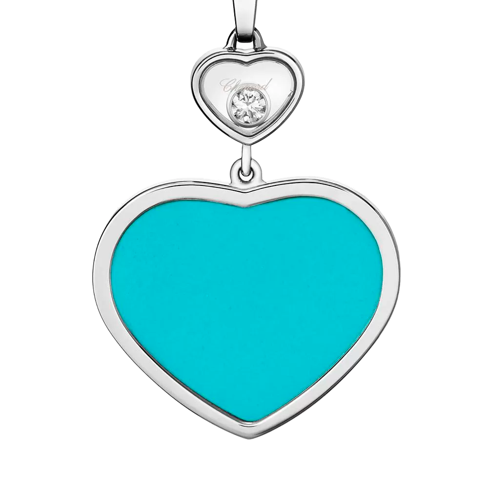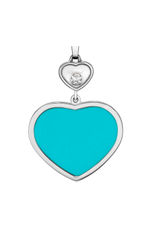Подвеска Chopard коллекции "Happy Hearts" выполненная из белого золота 750 пробы с вставкой из бирюзы и 1 плавающего бриллианта 0,05 ct. Длина цепочки - 42 см. Вес - 9,39 гр. Полный комплект.
