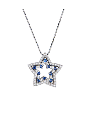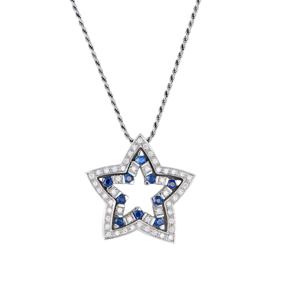 Подвеска - звезда Damiami коллекции "Belle Epoque" выполненная из белого золота 750 пробы с бриллиантами 0,40 ct., и сапфирами 0,90 ct. Размеры звездочки 26 х 26 мм. Длина цепочки - 50 см. Вес - 15,16 гр.