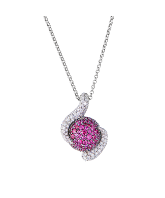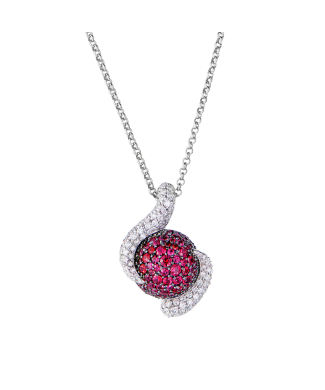 Подвеска De Grisogono коллекции "Boule" выполненная из белого золота 750 пробы с рубинами классической формы огранки и бриллиантами. Размер подвески 30 х 20 мм. Длина цепочки - 44 см. Вес - 13,49 гр. (Цепочка выполнена из белого золота 750 пробы, изготовитель РФ).