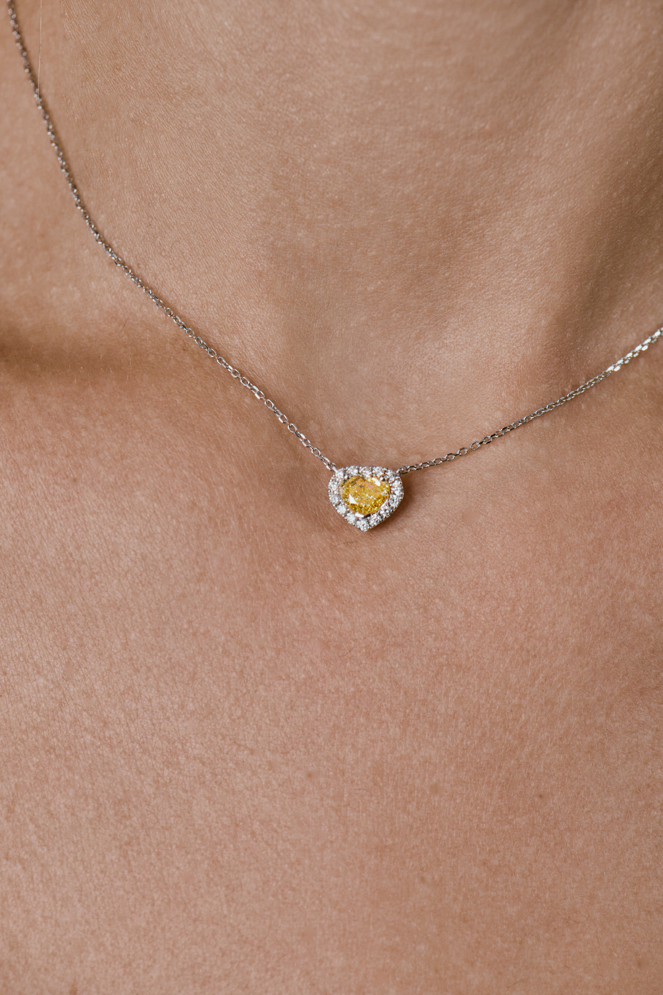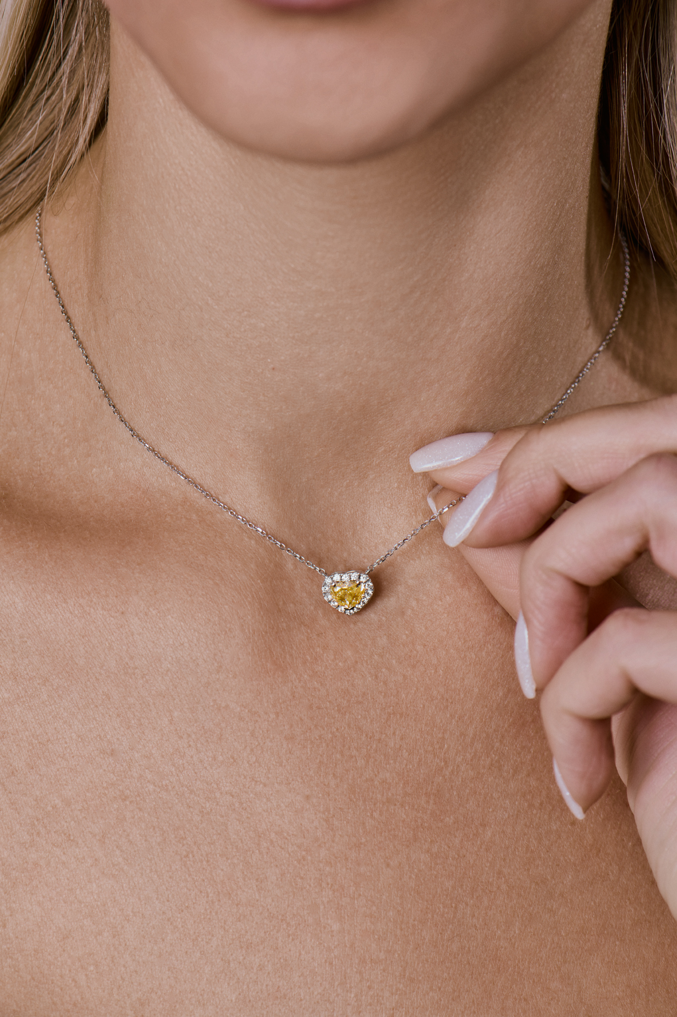 Подвеска DeRosa выполненная из белого золота 750 пробы 1 бриллиантом 1,01ct форма огранки "Сердце". Цвет - Fancy Light Yellow. Чистота - VS1. В обрамлении 14 бриллиантов классической формы огранки G-H/VS общей массой 0,17 ct. В комплекте сертификат GIA №5483987209. Вес - 3.61 гр. Полный комплект.
