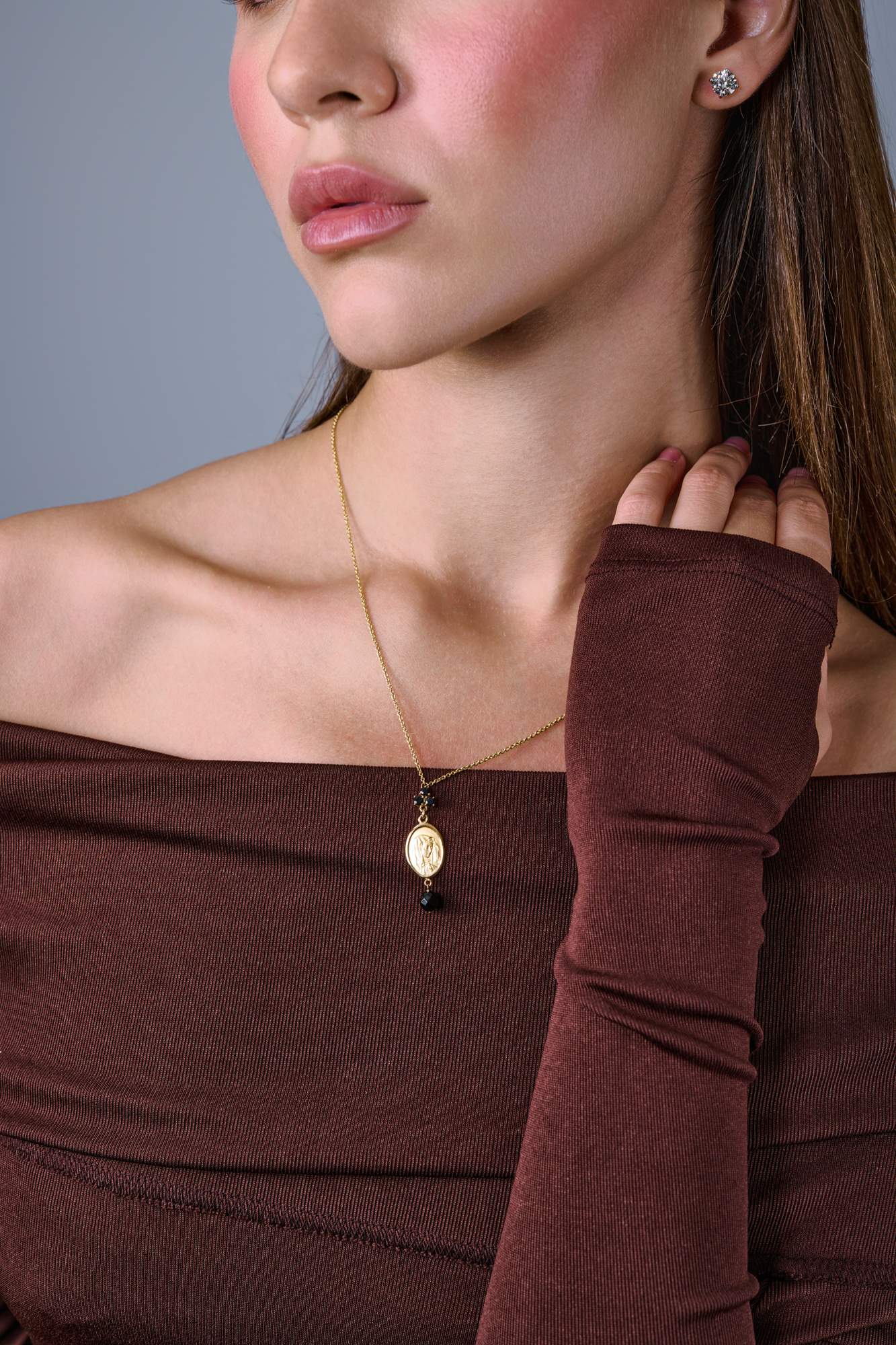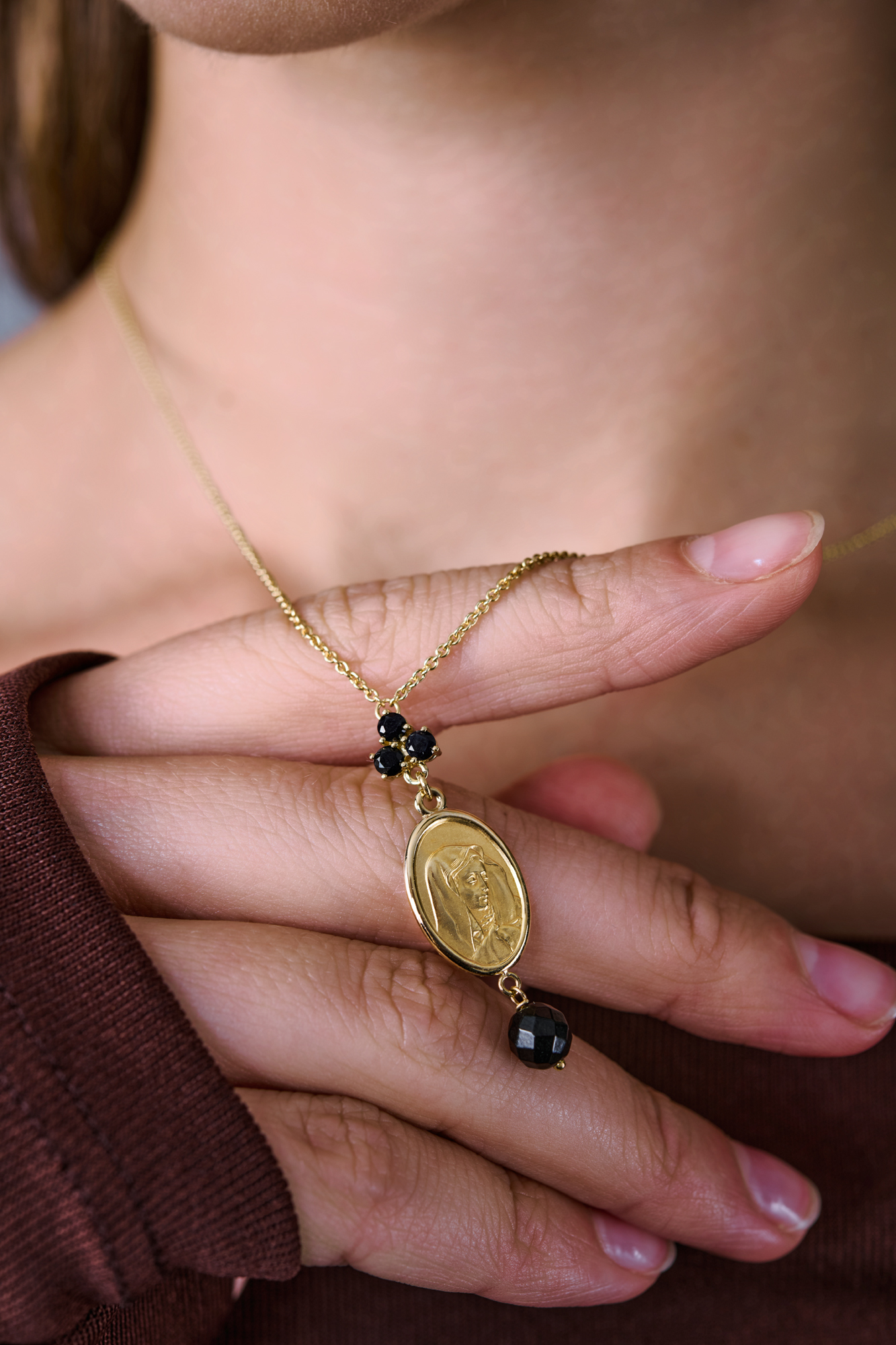 Подвеска Dolce & Gabbana коллекции "Sicily" выполненное из желтого золота 750 пробы с 3 черными сапфирами классической формы огранки и одним черным жадеитом. Длина цепочки - 50 - 55 см (регулируется). Вес - 8,38 гр.