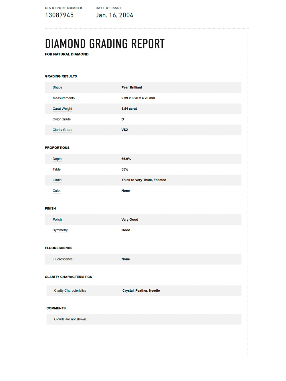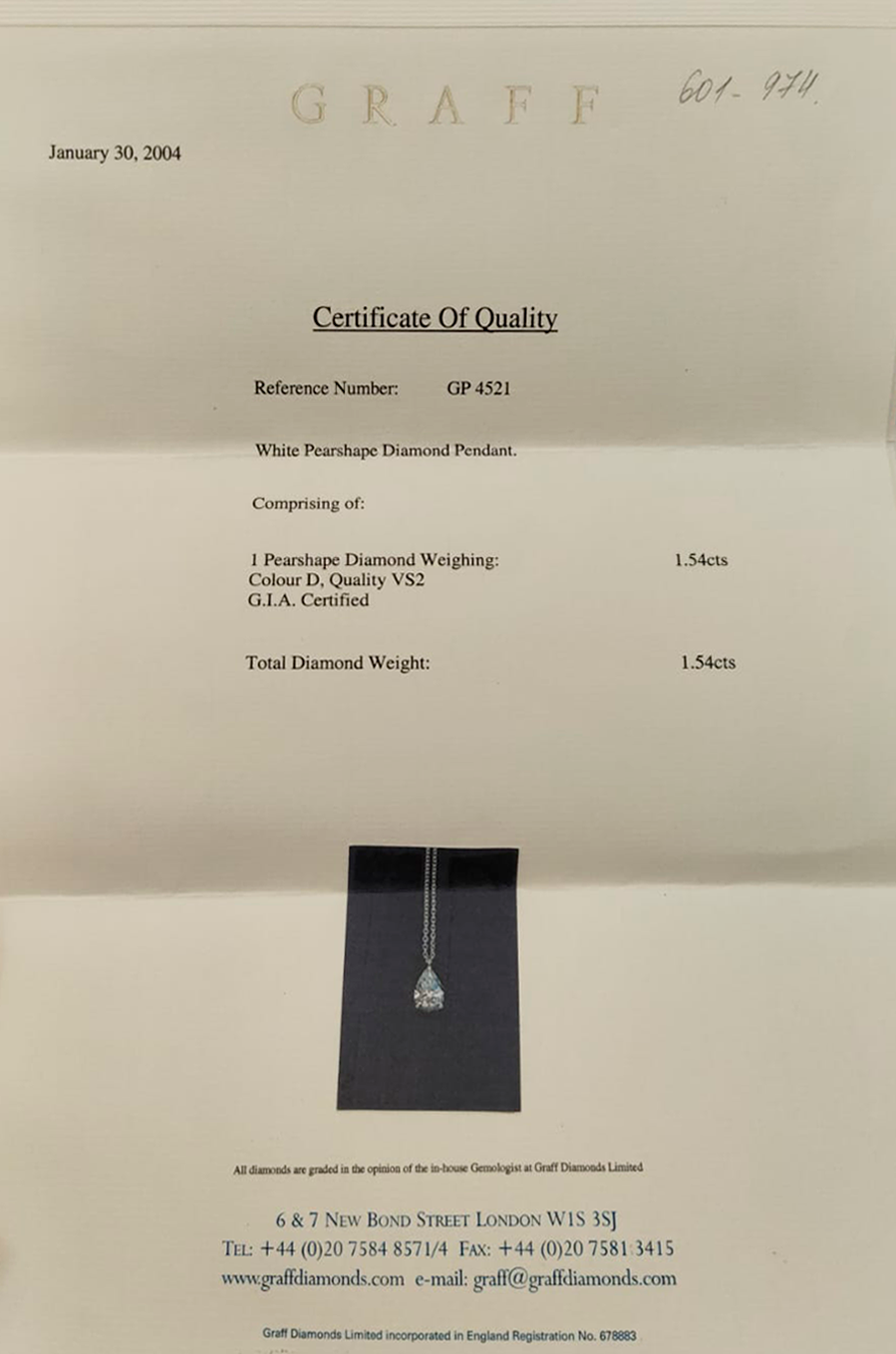 Подвеска GRAFF выполненная из белого золота 750 пробы и платины 900 пробы с бриллиантом формы огранки "Груша" массой 1,54 ct. Цвет - D. Чистота - VS2. Длина цепочки - 40 см. В комплекте прилагаются сертификат GIA и GRAFF.