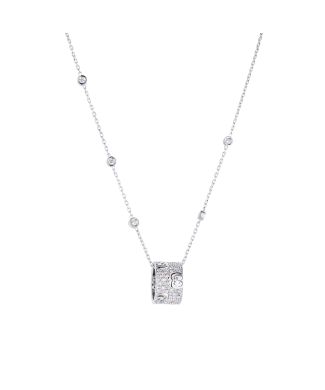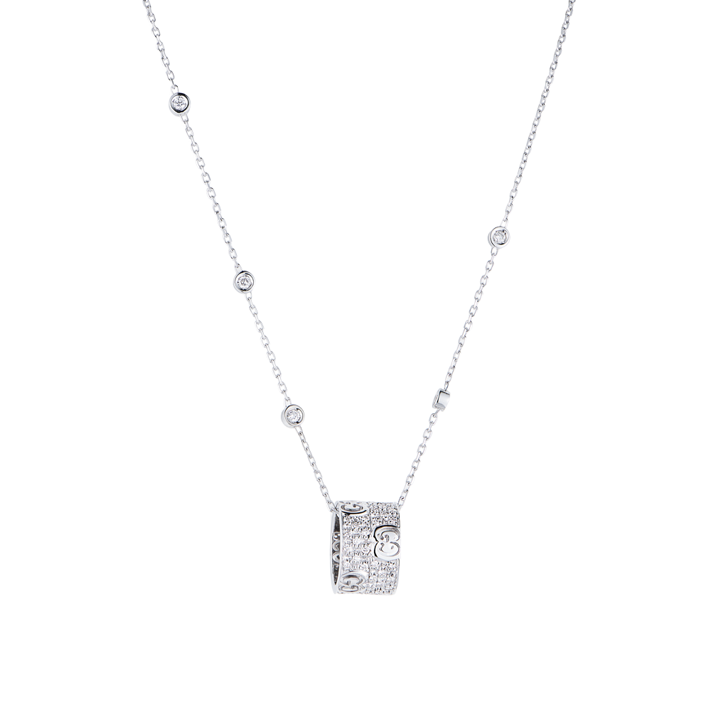 Подвеска Gucci коллекции "Icon Stardust" выполненное из белого золота 750 пробы с паве из бриллиантов классической формы огранки общей массой 0,62 ct. Диаметр подвески - 14 мм. Длина цепочки - 42 см. Вес - 9,16 гр.