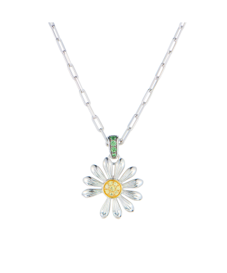 Эксклюзивная подвеска Jacob & Co коллекции "PEACEMINUSONE" выполненная из серебра 925 пробы с 8 желтыми сапфирами общей массой 0,11 ct, оправленными в желтое золото 750 пробы и 4 зелеными цаворитами общей массой 0,08 ct. Диаметр цветка 17 мм. Длина цепочки 50,8 см. Вес - 5,51 гр.